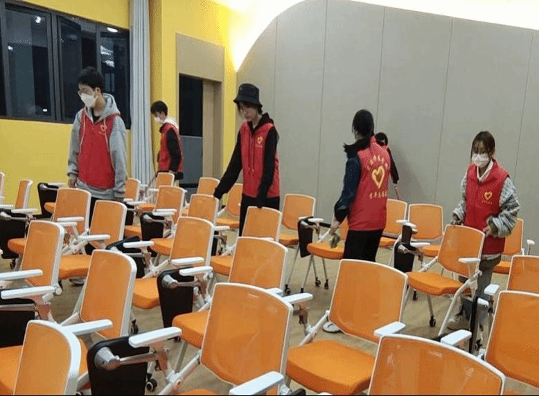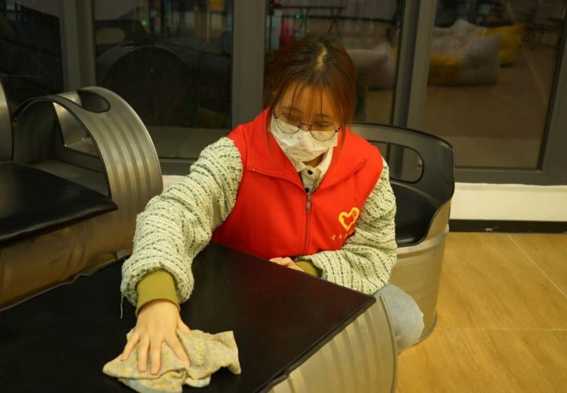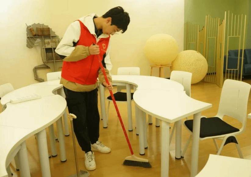 活动伊始,远景学院青年志愿者协会在远景书院集合准备,一个职位,一份使命,穿上那抹亮眼的志愿服,化身为“移通红”穿梭于远景书院、瀛溪书院与綦河书院功能室之间。安静的功能室随着志愿者们的进入,传出了志愿者们的谈笑声,青春的气息在功能室中开始蔓延。大门后,窗帘下,沙发里,角落间,手中的扫帚,抹布等清洁工具成为他们最趁手的“武器”,散落的头发,残留的垃圾,浅浅的灰尘消失在眼前。志愿者以认真负责的态度,不怕脏,不怕累的精神进行彻底的清洁,为书院增添了一抹动人的光彩。