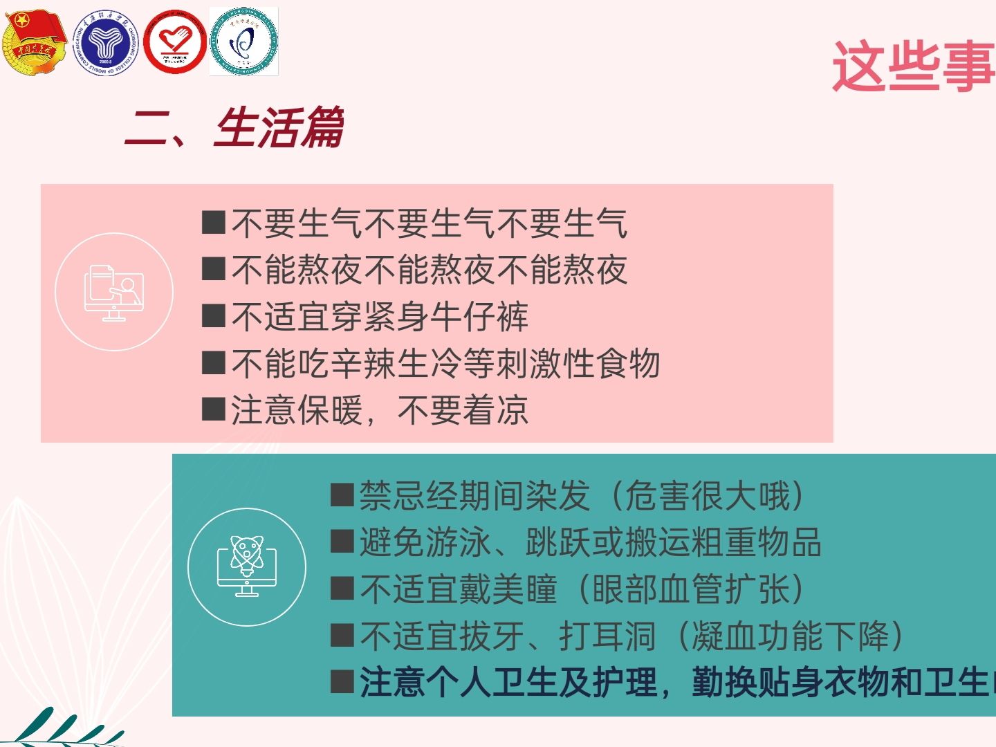随后就来到了活动的重点,即生理期间的注意事项。开始之前,主讲人播放了“女性经期全过程”的视频,让同学们了解女性一个月内的身体和心理变化,从而更好地理解经期小知识。紧接着,主讲人从饮食篇和生活篇一一进行讲解,这些看似很平常的小事却对女性健康有着极大危害,尤其是个人卫生方面,稍有不慎就会患上炎症。有这么多事情不能做,那有什么是女生能够做的并且能够帮助到自己的呢?对此主讲人向大家展示了如何在经期前中后期进行自我调理与健康食谱,还带领同学们观看了“来月经的注意事项”视频,让女生们舒适度过生理期。