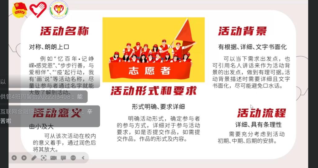 李芙敏同学从班团支队管理要求和班团项目立项申报流程出发,为同学们讲解如何策划、举办一场志愿活动。在讲解过程中,李芙敏同学积极与同学互动,为同学答疑。让大家了解各班团支队长需履行义务,积极参与学院青协组织的支队长培训。班团支队在参与活动时与专项支队要求一致,成员需严格要求自己,不做有损志愿者形象的行为。班团支队需积极配合学院工作,纳入对班团支队的考核。学习如何开展班团志愿活动,不仅可以不断提升个人能力,也能运用到日常班级活动的策划中,还能够在锻炼中获得自我精神上的满足,增强自信心。