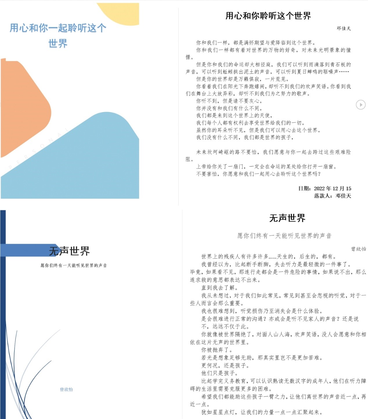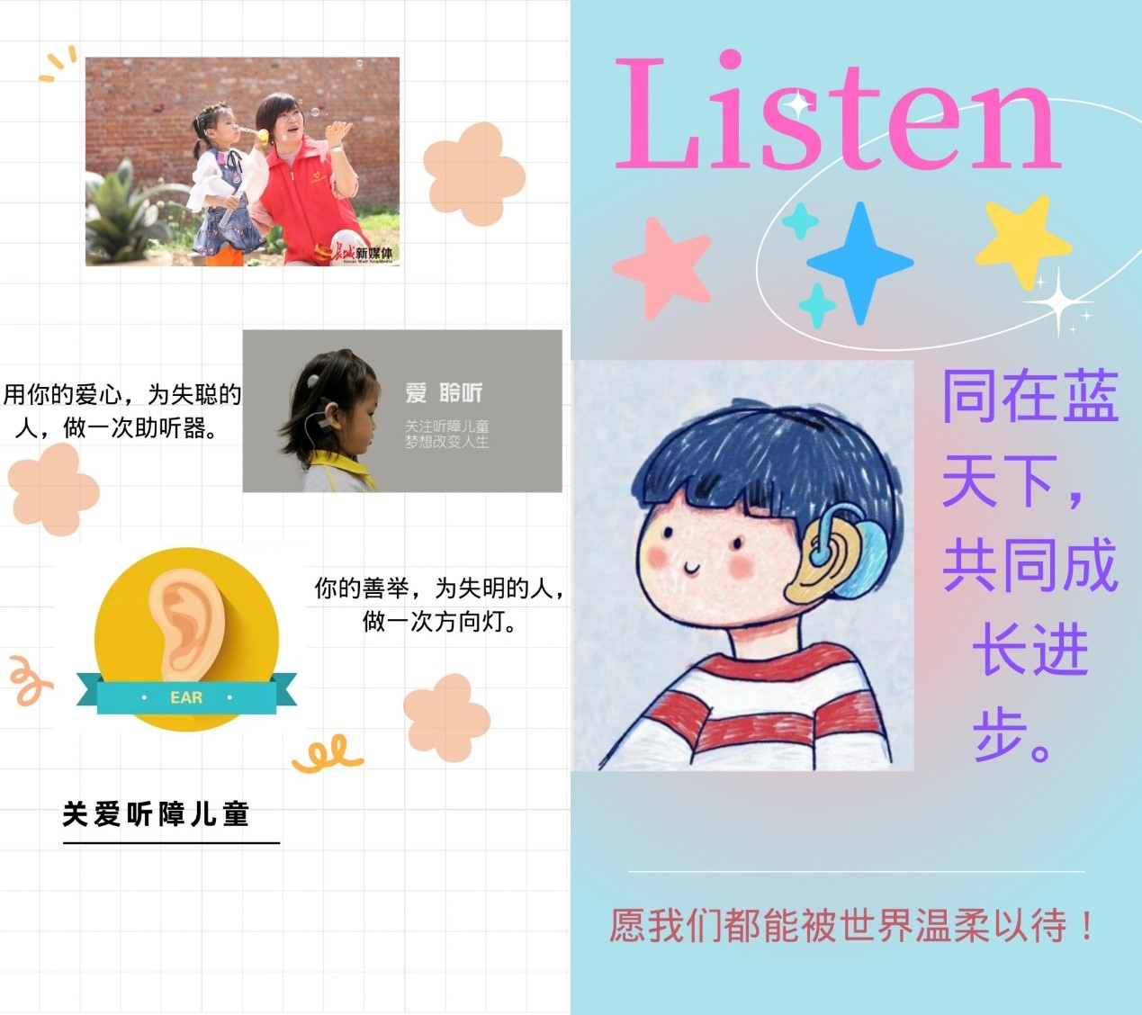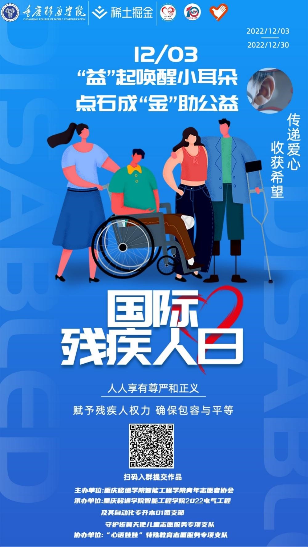 12月3日是“国际残疾人日”,为了助力听障折翼天使,用爱续航,让孩子们听见世界的声音。智能工程学院2022级电气工程及其自动化专升本01团支部联同智能工程学院青年志愿者协会守护“折翼”天使儿童志愿服务专项支队在2022年12月10日——12月15日举办了一场《“益”起关爱残疾人系列活动》之“益”起唤醒小耳朵,点石成“金”助公益作品征集活动。参与活动的同学通过海报、图片、文字和手语视频等方式,来关爱身边的折翼天使。