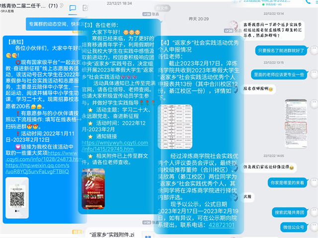 为深入学习宣传党的二十大精神,贯彻落实习近平总书记关于青年工作的重要思想,深入学习习近平总书记在庆祝中国共产主义青年团成立100周年大会上的重要讲话精神,用实际行动在以中国式现代化推进中华民族伟大复兴的使命任务中贡献青春力量。在重庆移通学院青年志愿者联合会指导下淬炼·国际商学院开启了2023年寒假“返家乡”社会实践活动,号召同学们在2023年寒假期间参与社会实践和志愿服务。