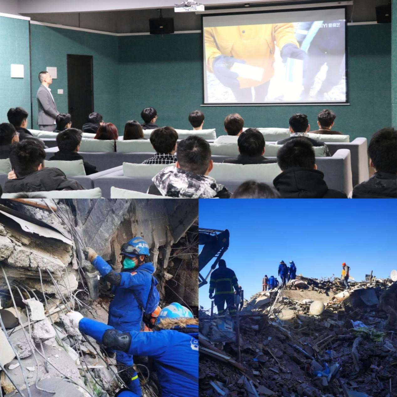 重庆市蓝天救援队第二梯队成员于2月11日从广州白云机场赶赴土耳其,抵达后前往马拉蒂亚。刘闯同志告诉大家,在面对灾难时他们并不能盲目而行。马拉蒂亚灾区损毁严重楼房重度损毁,在“蛮干”前蓝天救援队成员根据“结构工程师”们精密计算后才开始分工施救。救助他人的同时也要顾及自身生命安全,切勿盲目施救!目之所及皆为废土,这惨不忍睹的场景对在场人员的心理有着极大地打击力,所以同学们还应培养过硬的抗压能力。遍地破碎的钢筋混泥土,随处飘散的腐臭气息等等情况对救援人员来说都是一项心理考验。
