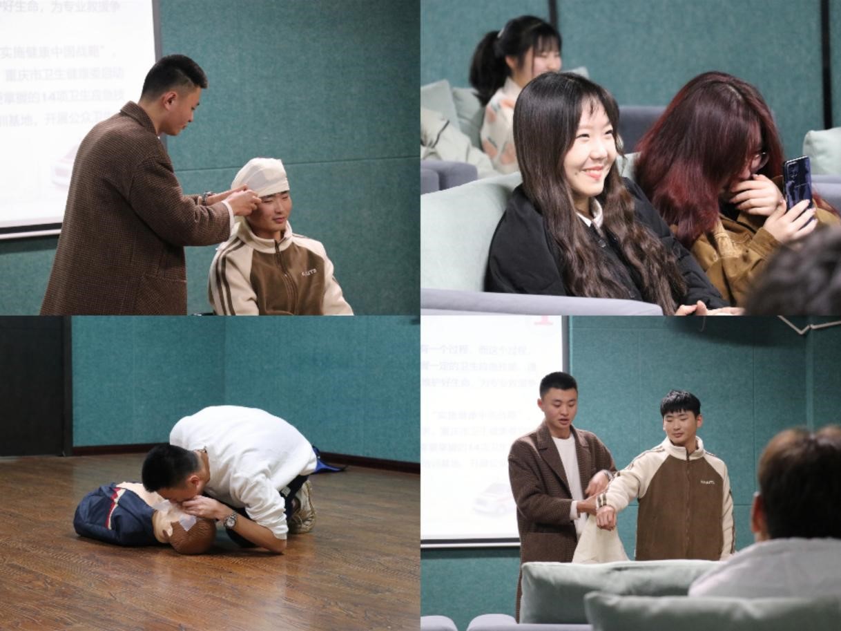 刘闯同志讲解完抗震救灾知识后,智能工程学院青协蓝天应急救助志愿服务专项支队成员朱政君志愿者为大家演示了正确实施“伤口包扎”和“心肺复苏”的方式。无论是颅部止血还是躯干止血,志愿者同配合演示的同学将方法及其细致演示给同学们看。在演示心肺复苏时,朱政君志愿者用人体模型亲身示范,无论是救助步骤顺序还是处置细节他都有重点强调,全过程和同学们的互动也相当丰富。