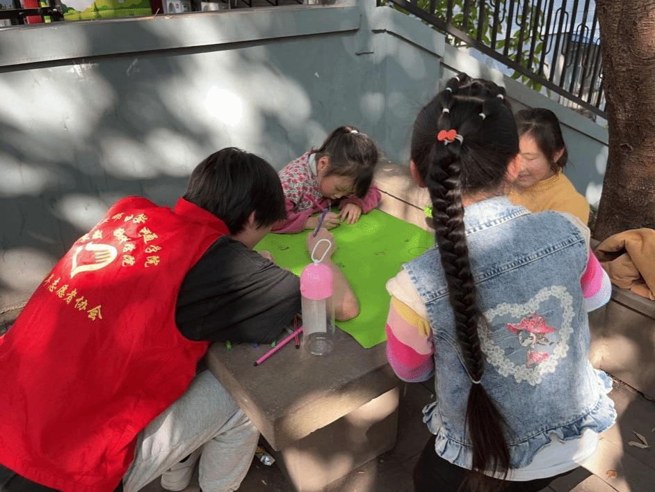 志愿者们组织了画画、打球等活动。在志愿者的协助和引导下,小朋友们通过画画,脑海里的奇思妙想跃然纸上,纷纷展示了自己对成长道路上的各种见闻,通过询问小朋友们的自身经历,大家的关系也更为亲近,大小伙伴们打成一片,广场上充斥着欢声笑语。