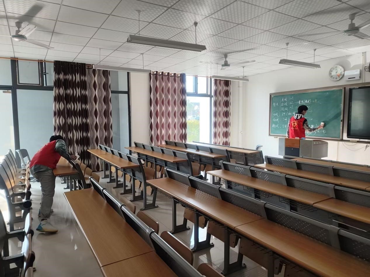 首先,支队长向志愿者们讲解注意事项以及人员的分配。志愿者们分工明确,每一组都有一位志愿者负责擦黑板,保证黑板以及讲台的整洁,其余人员则负责检查桌子抽屉里是否有垃圾以及将桌椅的归位。志愿者们相互配合,高效完成支队长交代的任务,不怕苦,不怕脏,用自己的力量为同学们创造舒适整洁的生活学习环境。