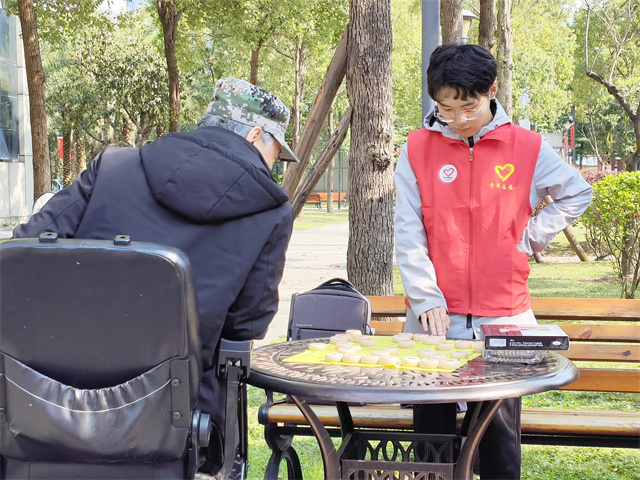 志愿者们分工明确,在一边传来欢声笑语的同时,另一边逸轩棋社的志愿者陪着老兵们正热火朝天地开展着象棋比赛。双方在棋盘上横马跳卒,车攻炮轰,你来我往,难解难分。老兵们对象棋充满了兴趣,紧紧围着小小的一张棋盘“指点江山”。志愿者了解到象棋是老兵们为数不多的乐趣之一,以前都是自己互相比拼,今天可以和志愿者一起共享这份乐趣,感到十分新奇与满足。看着老兵们脸上展开的笑颜,志愿者十分自豪,这又将变成一段美好有意义的珍贵回忆。