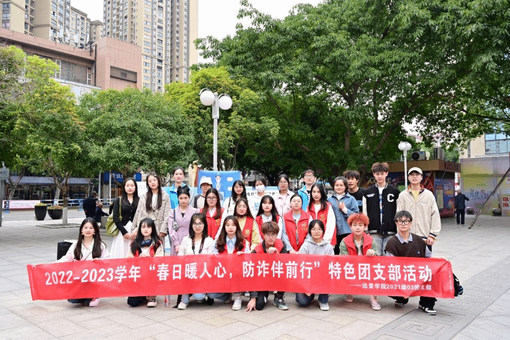 活动的最后,03团支部收拾好垃圾,整理好现场,拉上横幅,在步步高广场处前合影留念。本次活动受益人数约1000余人,相信在远景学院2021级03团支部的宣讲下,合川区合阳城街道步步高广场附近的居民认识到诈骗的危害性,不仅是居民们增强了辖区居民识别和防范电信网络诈骗的意识和能力,也让团支部成员们在这一次实践活动中锻炼到了交际表达能力,这正是学校完满教育的魅力所在。在03团支部多角度地开展反诈宣讲活动下,一定会为“反诈”贡献一份青春力量,希望大家都为之而奋斗,这样离打造浓厚全民的防诈打诈良好氛围就近在眼前!