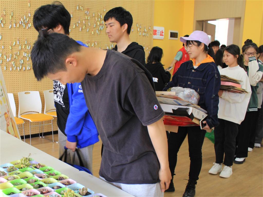 活动火热进行中,排队置换的同学井然有序,自愿地排起了长长的队伍,配合志愿者将废纸、水瓶进行整理放置。在废纸、水瓶进行整理时,难免有垃圾的残留,对此同学们没有无动于衷,他们将垃圾收集起来,放到垃圾桶里,此时校园的环保风气从同学们的举手投足中悄然飘出。
