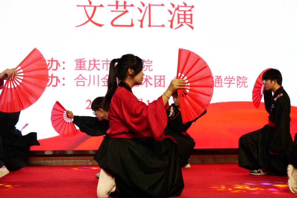 主持人一上台,热烈的掌声便响彻了整个会场,开场表演是由合川区金鹰艺术团带来的《娘子军连歌》,老兵们专注于表演,聚精会神地观看着。紧接着是志愿者带来的舞蹈《踏山河》,各志愿者舞蹈动作整齐划一,充分展示着移通学子的精气神。随后登场的《红歌三连跳》《祖国不会忘》等舞蹈表演,展现了抗战的不易、英雄们曾经的辛苦,也深深地表达了对老兵们的敬仰。