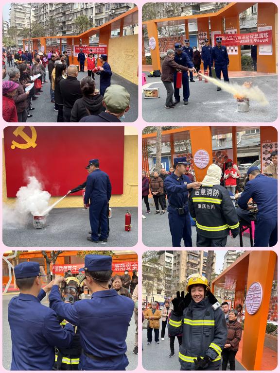 “火善用之则为福,不善用之则为祸”。消防员“蓝朋友”们为居民介绍了灭火器使用方法,并引导大家正确使用灭火器,正确处理火灾危险。紧接着,“蓝朋友”们为大家科普消防器材,展示火灾应急救援服的穿戴方式。厚重的救援服使大家懂得救援英雄的不易与伟大,懂得“最美逆行者”扛下的责任与担当,是他们用“火焰蓝”守住“中国红”。