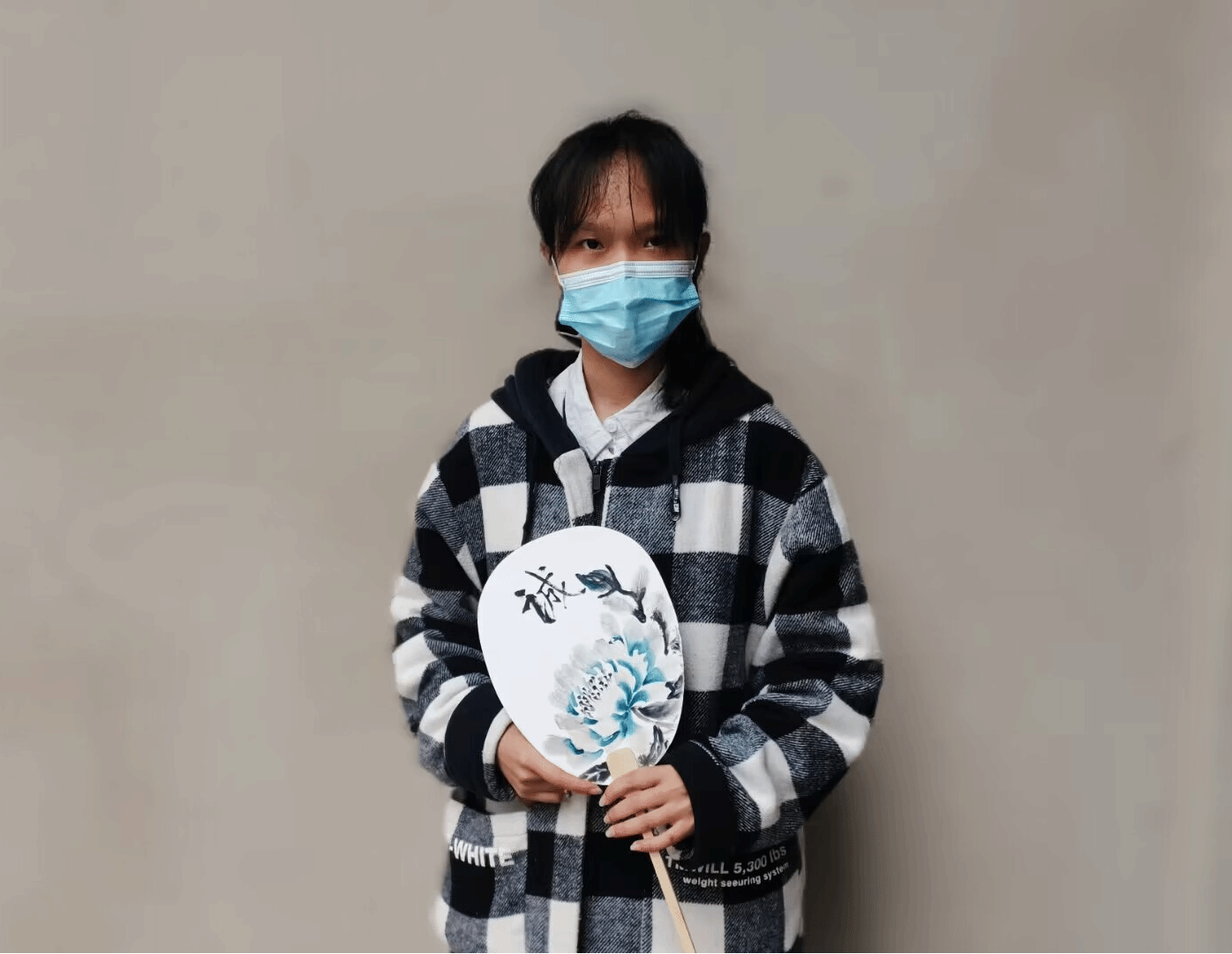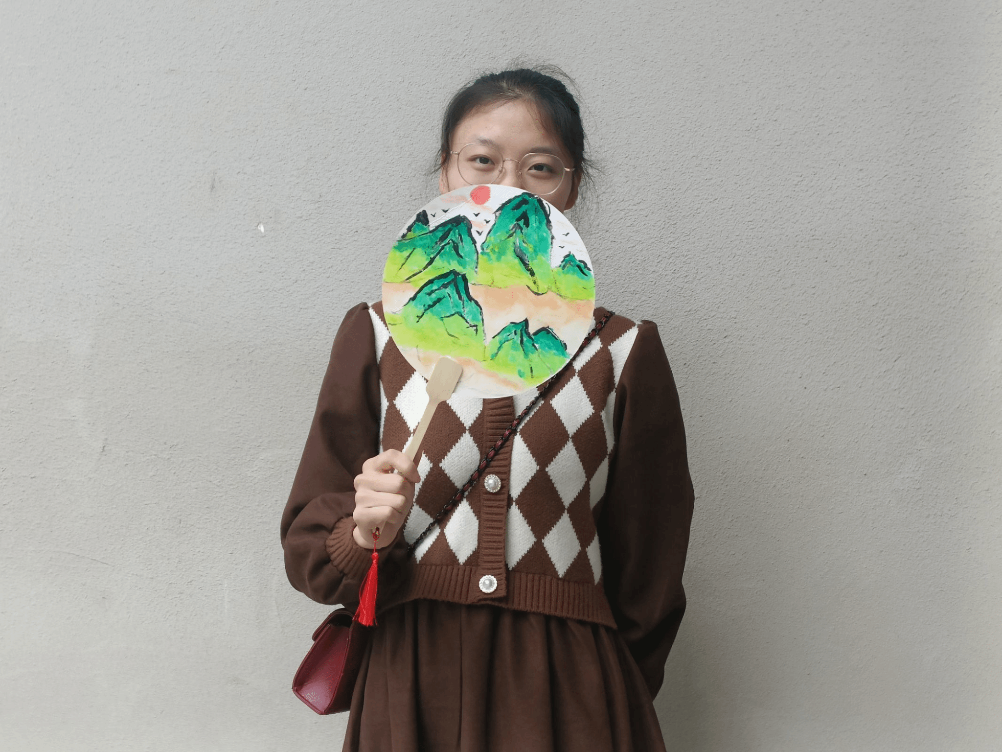 在诚信与团扇的灵感碰撞中,她素手执笔,轻柔灵动,以丹青绘出了危峰耸立的青山,仿佛这就是她心中的诚信,如巍巍群山难以攀登,却长青立于朝阳之下。她姗姗来迟,却意存笔先,弹指间,便落笔生花,一朵牡丹跃然纸上,点墨绘出心中诚。