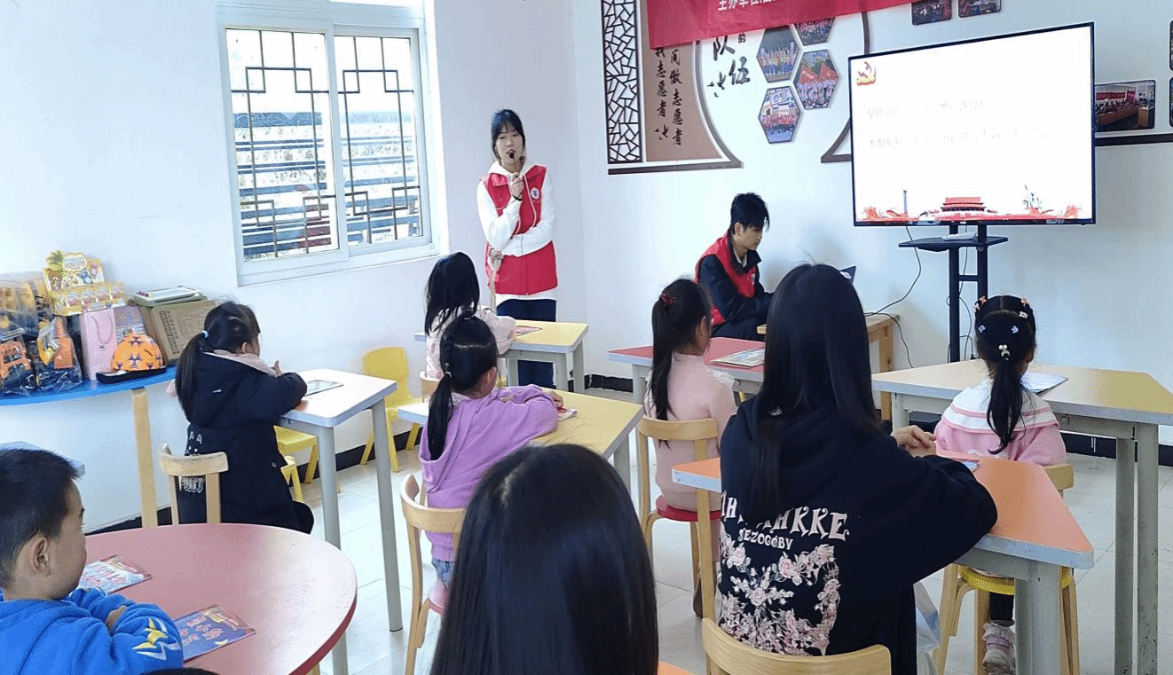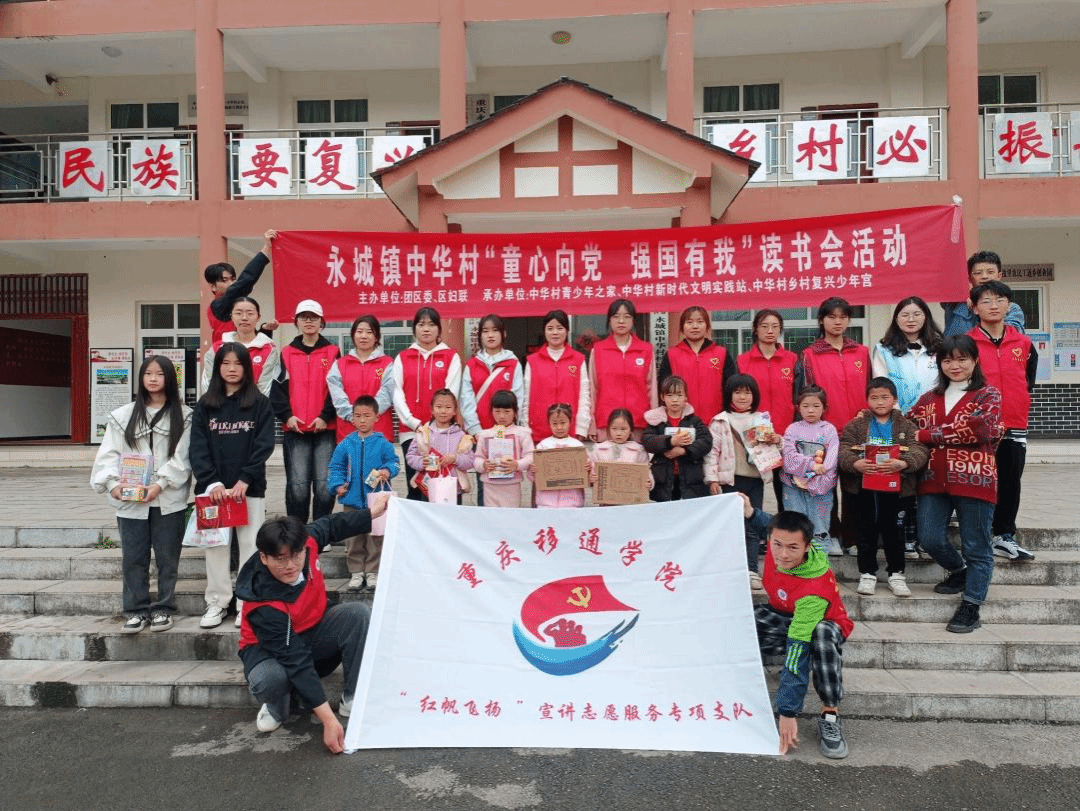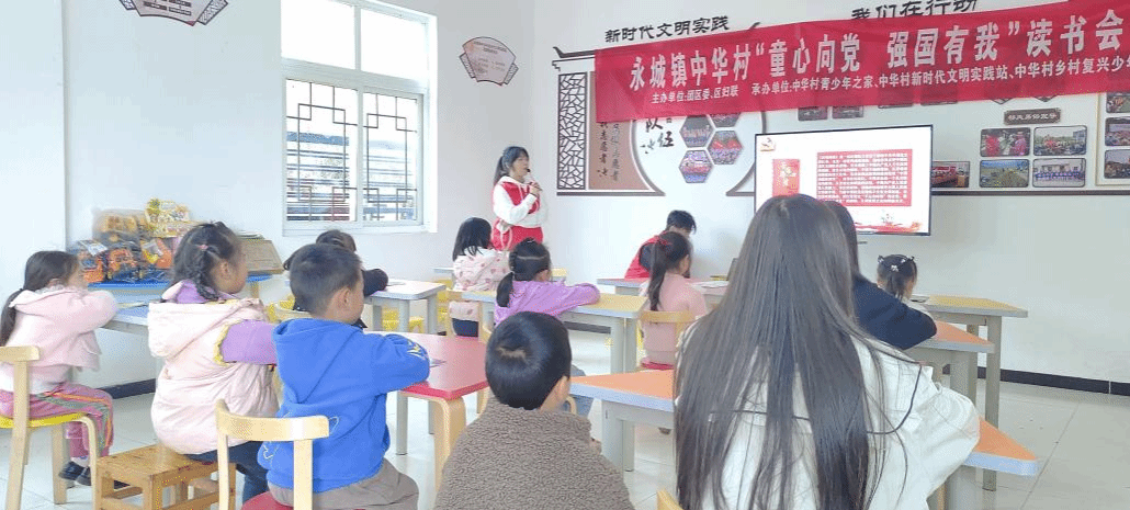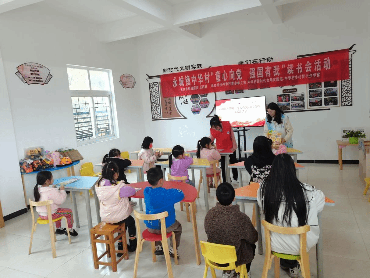为了厚植家国情怀,激发孩子的阅读兴趣和增加亲子感情,养成阅读的好习惯,丰富农村群众的文化生活,引领新时代农民群众积极健康的生活方式,特开展此次活动。2023年3月26日15时,我校团区委区妇联联合中华村青少年之家、中华村新时代文明实践站、中华村乡村复兴少年宫在永城镇中华村青少年之家,“红帆飞扬”宣讲志愿服务专项支队共同开展了“童心向党强国有我”读书会主题活动。此次活动目的在于弘扬中华民族传统美德,培养少年儿童的阅读兴趣,营造浓郁的家庭读书氛围。此次活动参与率很高,氛围浓厚,得到了在场家长们的一致好评。本次活动由“红帆飞扬”宣讲志愿服务专项支队成员——向珂仪主持。