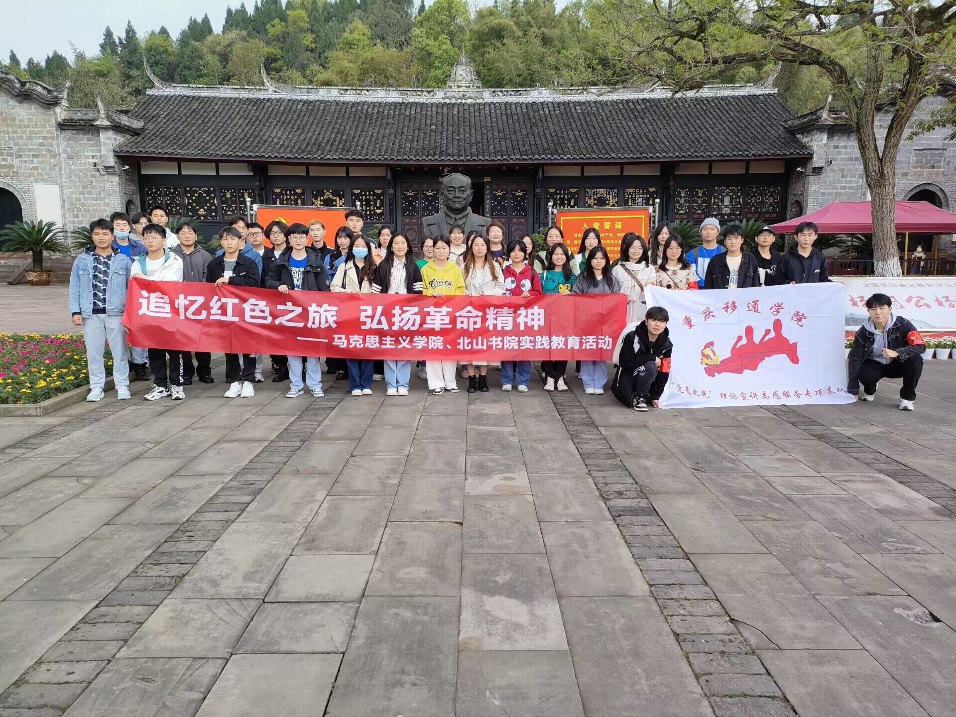 为巩固拓展“四史教育”主题教育成果,响应中共中央《关于在全社会开展党史、新中国史、改革开放史、社会主义发展史宣传教育的通知》的号召。2023年3月29日,重庆移通学院通信与信息工程学院“党青之光”理论宣讲志愿服务专项支队联动我校思政教学部靳银霞老师在潼南区杨尚昆故居举行了“百年伟业风云荡重走征程•四史学习笃定信仰不忘初心”志愿服务活动。