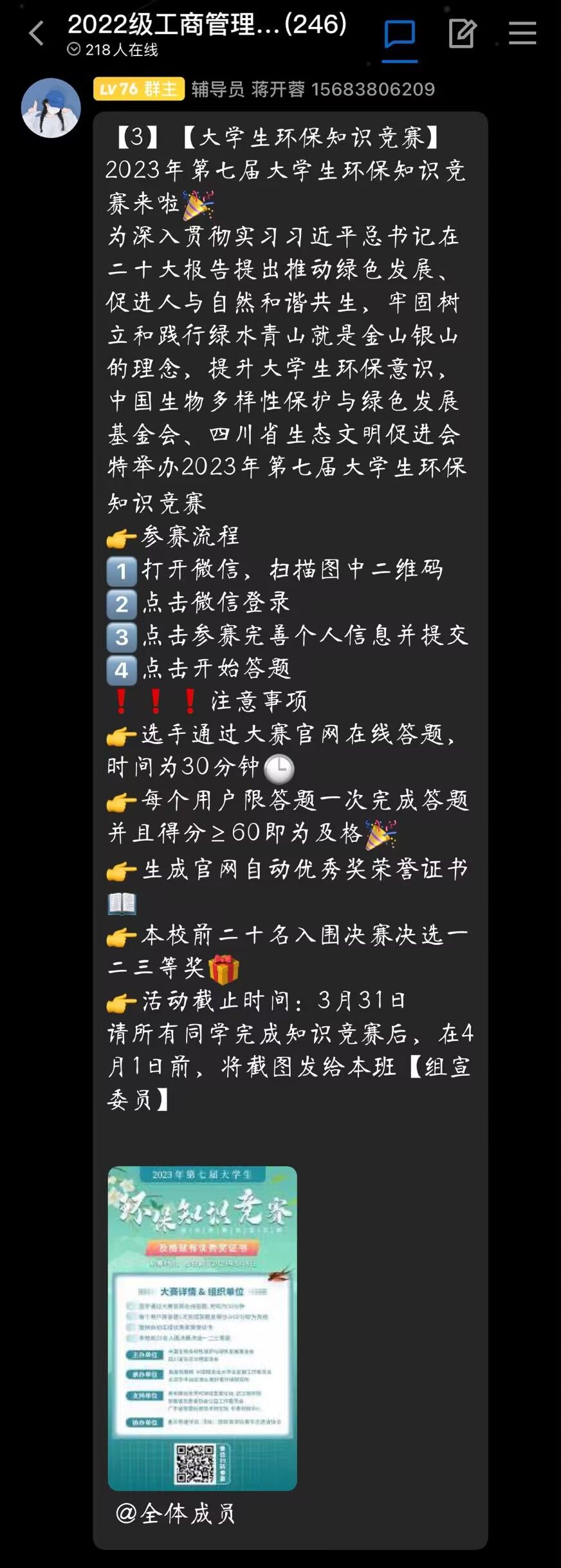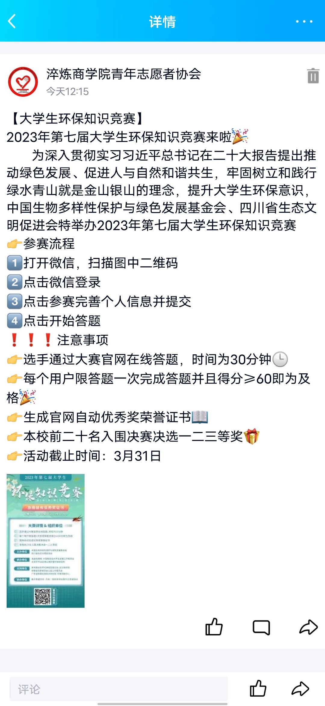 2023年3月24日至3月31日,重庆移通学院淬炼·国际商学院青年志愿者协会借助2023年第七届大学生环保知识竞赛开展了以“共进步·绿发展”为主题的环保知识竞赛。在此次竞赛中,淬炼·国际商学院青年志愿者协会动员了全校各年级各书院的师生,让所有人都参与到了本次环保知识竞赛当中来。呼吁全校师生践行环保理念,保护环境,关爱我们的地球,同时助力青年环保事业的发展。