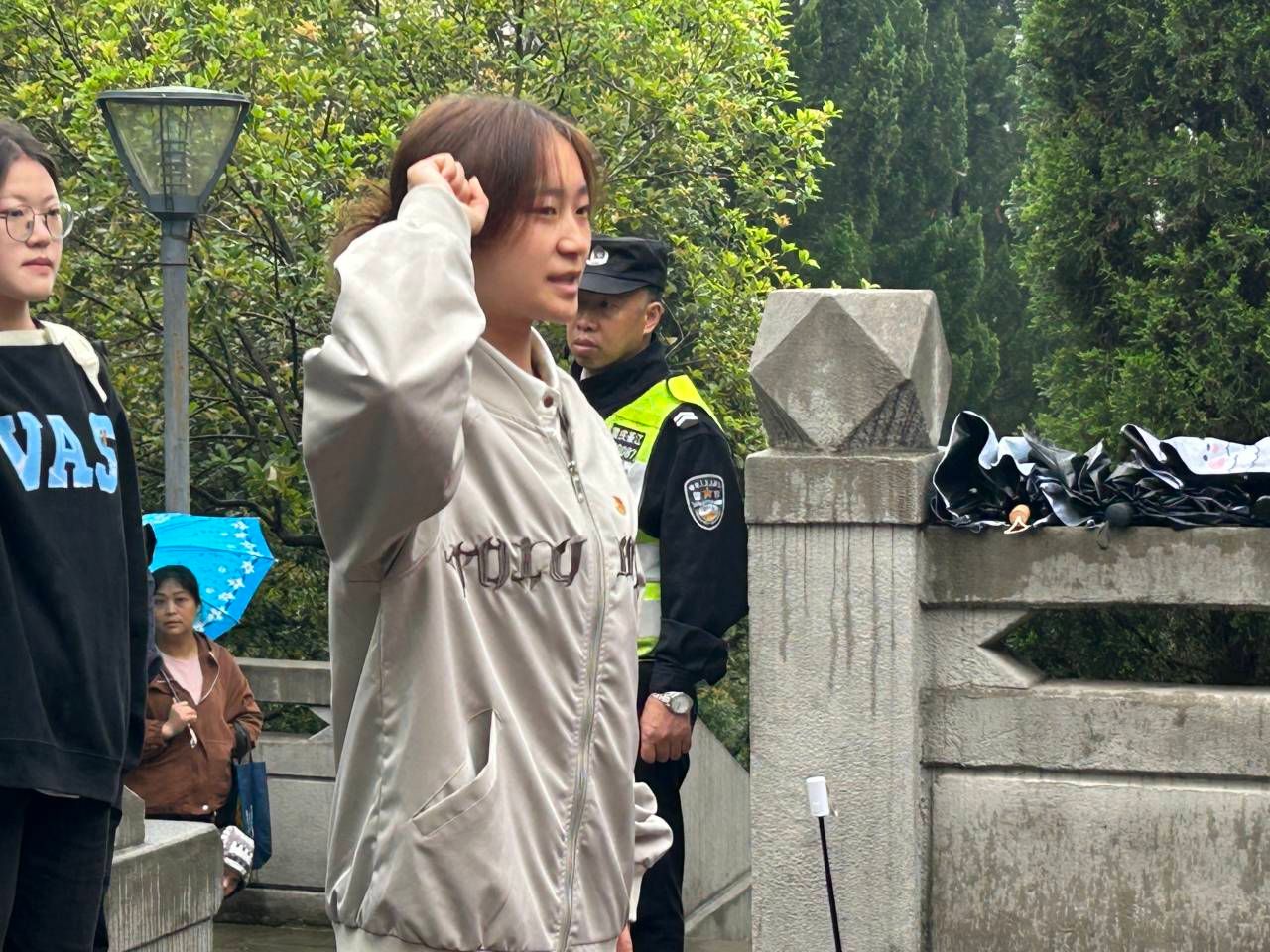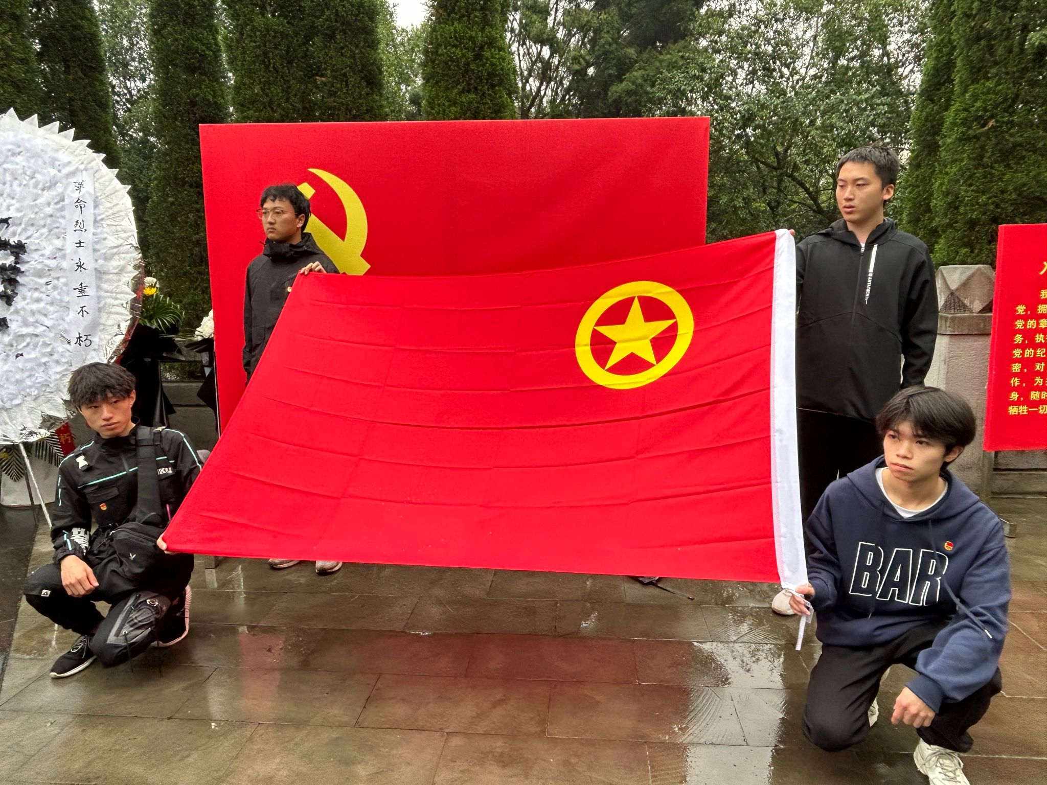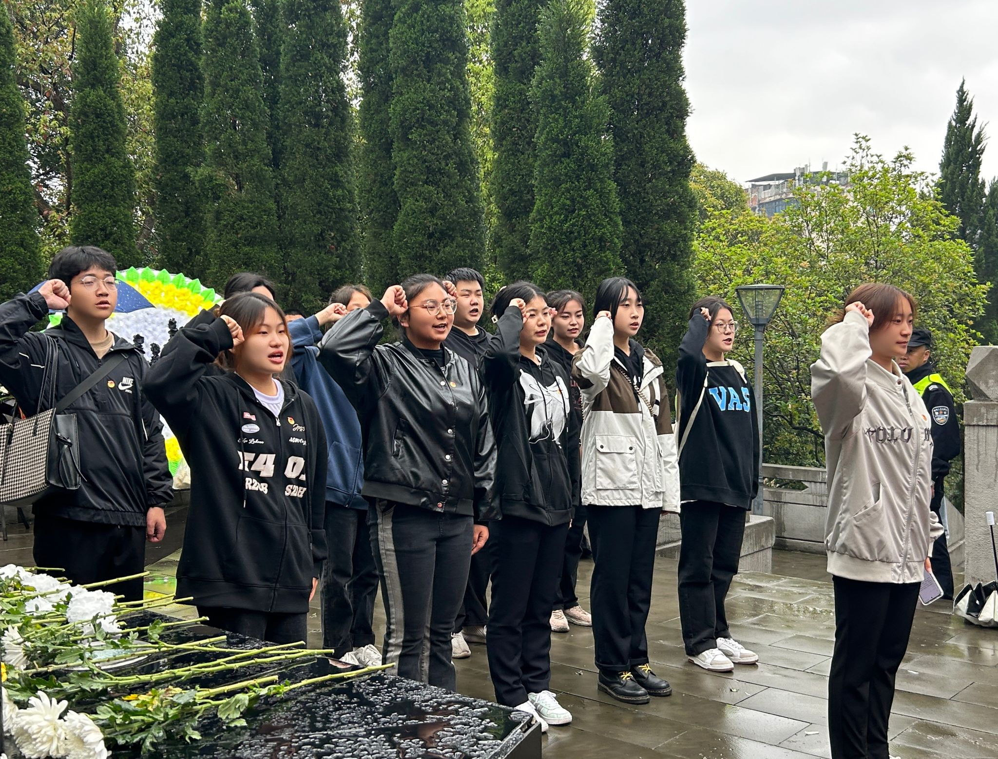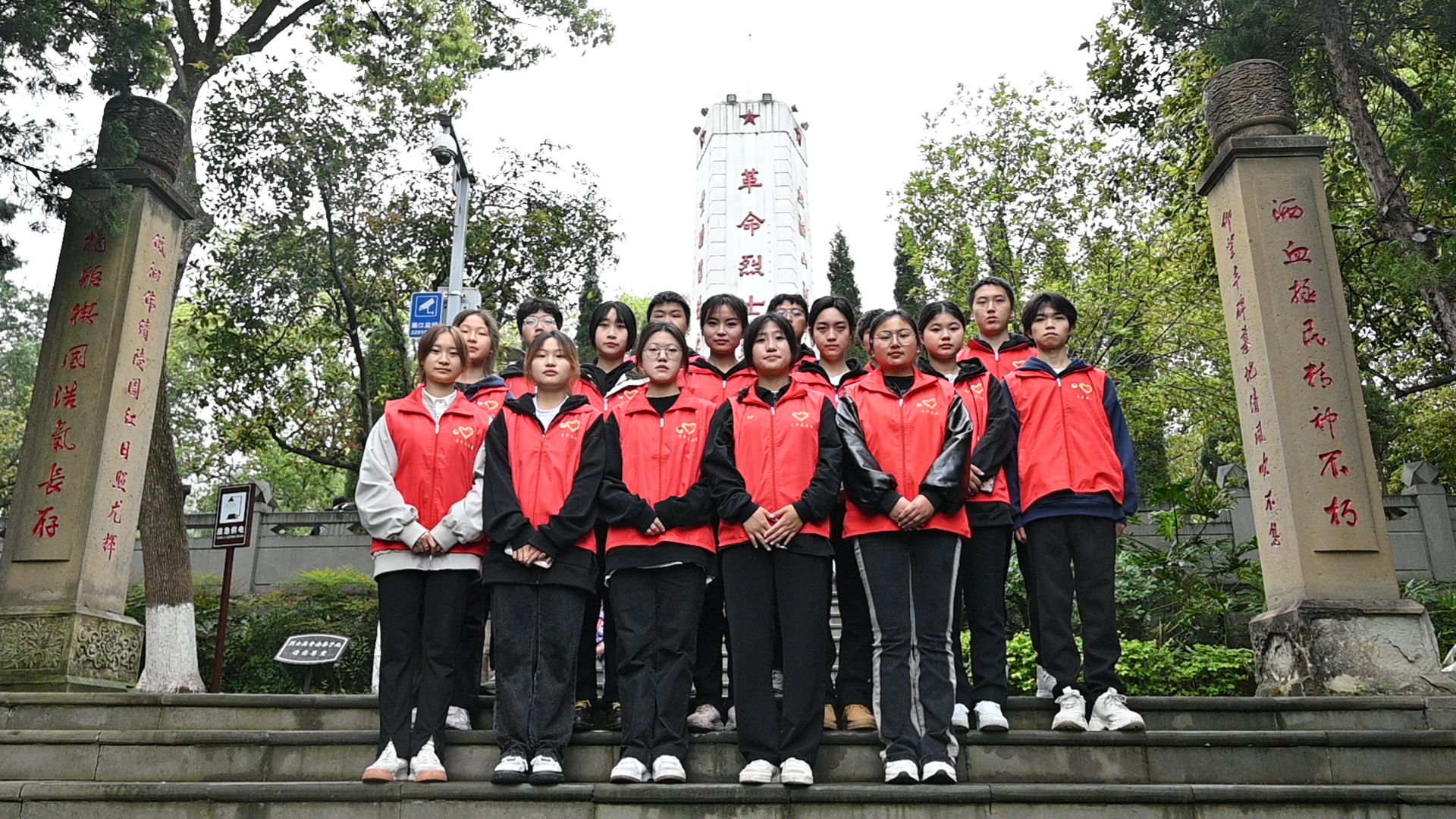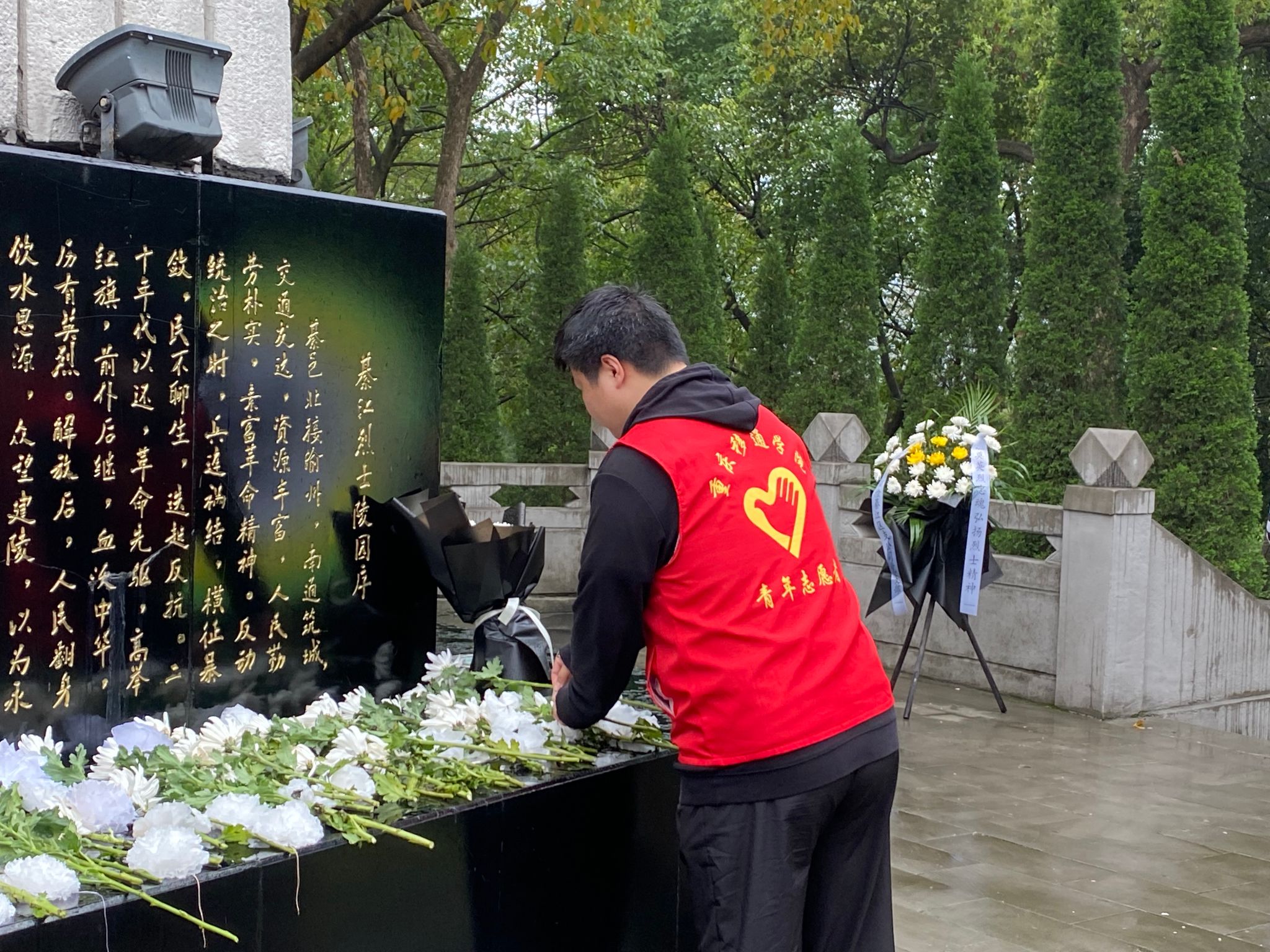 到达烈士陵园,每位志愿者都佩戴好团徽、列好方阵,伴随着微风细雨请出团旗并行注目礼,展示朝气蓬勃、昂扬向上的精神风貌。《中国共青团团歌》奏唱在纪念碑前,一首歌的时间让志愿者们重读他们的故事、追寻他们的足迹、缅怀那些不能被忘却的回忆。歌声嘹亮,唤醒了全体志愿者的使命意识和责任意识。