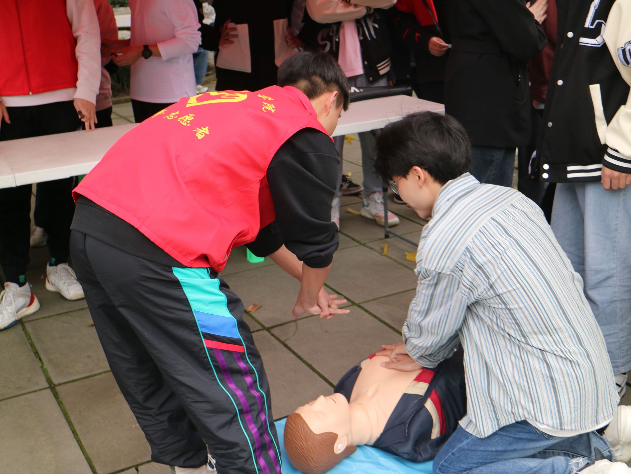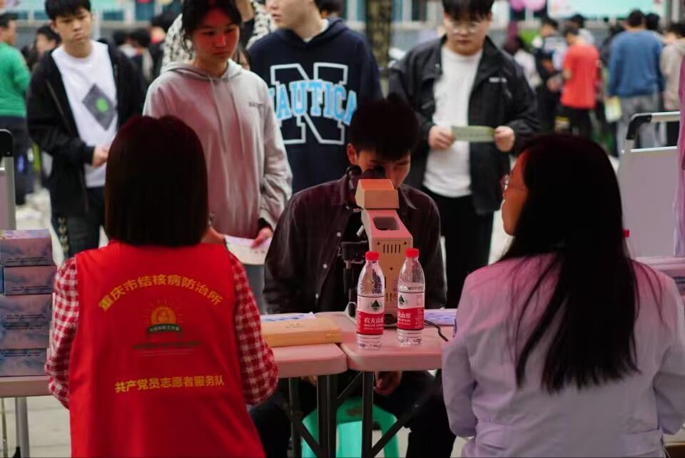 4月7日14:00,控制结核病线下体验活动于黄桷树广场开始,此次活动提供了两个体验场所,重庆市肺结核防治所专业老师为大家进行了关于结核病专业的讲解,也带来了显微镜方便同学们更进一步观察结核杆菌。智工青协蓝天应急救助志愿服务专项支队工作人员在现场给同学们讲解演示心肺复苏术的操作流程并让同学们体验参与。