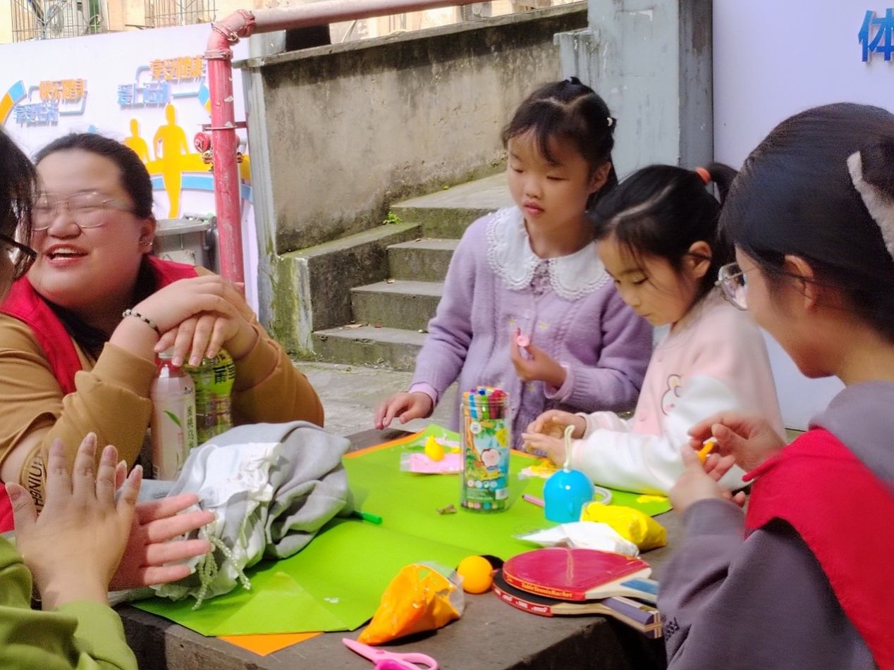 在手工制作中,志愿者也很耐心地向小朋友们介绍材料及发放材料,用心辅助小朋友完成手工制作,孩子们互帮互助,自己动手操作,充分感受到了手工创作的魅力。