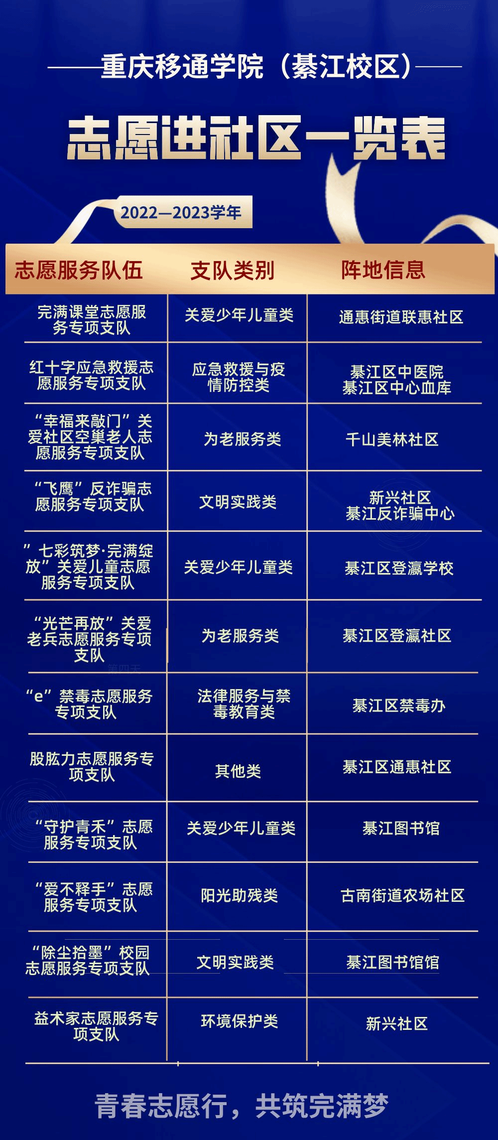 2022年底,以共青团中央名义发布《高校共青团青年志愿服务工作指引》,为大力落实党的工作,以工作指引为参考,重庆移通学院綦江校区志愿专项支队走进社区、服务当地。志愿服务组织与社区共同研究制定活动计划,明确活动内容和时间,共同准备各项活动有序开展。将25个支队特色结合居民需求开展特色志愿服务,围绕文化体育、法治宣传、生态环保、禁毒防艾等内容,打造“一社区一特色”,形成常态化的特色志愿服务活动,孵化志愿服务精品项目。