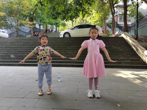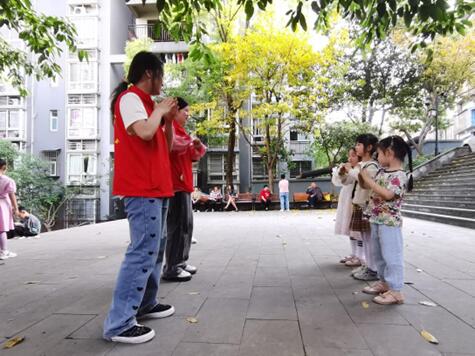 志愿者们和小朋友们都怀揣着对彼此的思念前往小广场,小朋友们洋溢着灿烂的笑容,与志愿者们愉快相拥。当我们问道:“小朋友,你们喜欢跳舞吗?你们喜欢唱歌吗?”小朋友立马回答到:“姐姐,我可喜欢跳舞唱歌啦!最近还新学了一首歌呢。”随后,志愿者们带领社区小朋友唱起了《你笑起来真好看》这首充满童趣的歌谣,大家都沉浸在美妙的音乐中,随着音乐律动。小朋友们始终保持高度的热情伴随音乐打着节拍做动作,还有一些小朋友更是在志愿者们的带领下,当起了“小小老师”,去帮助更小的小朋友学习熟悉动作、共同游戏。