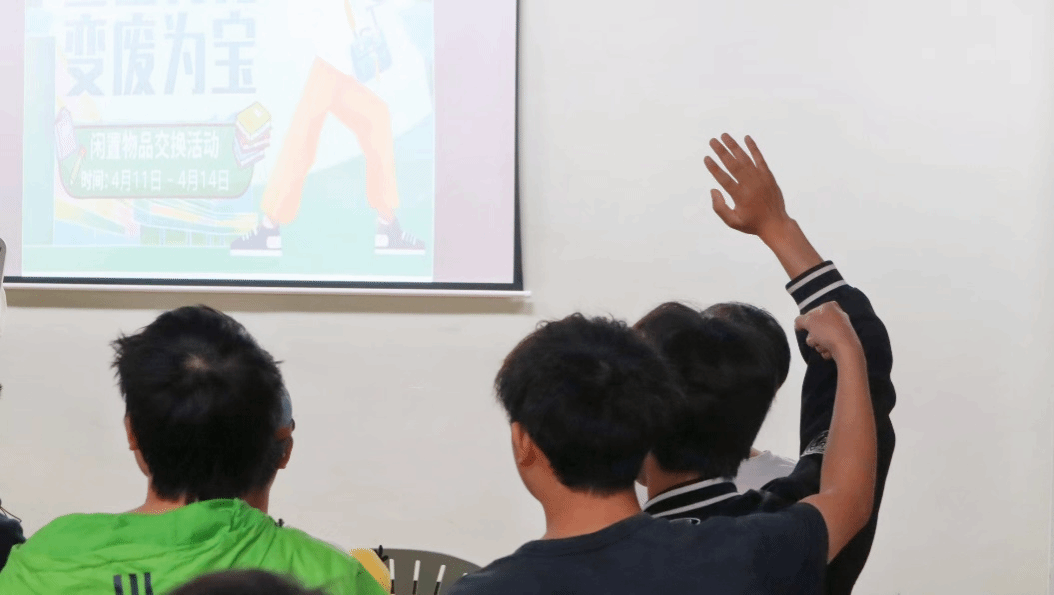 有的同学拿出了尺码不合的卫衣,有的同学拿出了放置已久的帆布包,还有的同学拿出了多余的小风扇、挂钟、书签、小玩偶等等。这些自己认为无处可用的闲置物品,却深深的吸引了台下的其他同学们,大家争相举手想要进行交换。虽然于自己而言用处不大,但在这里却遇到了它们的“命中注定之人”,活动氛围轻松有趣,欢声笑语接连不断。
