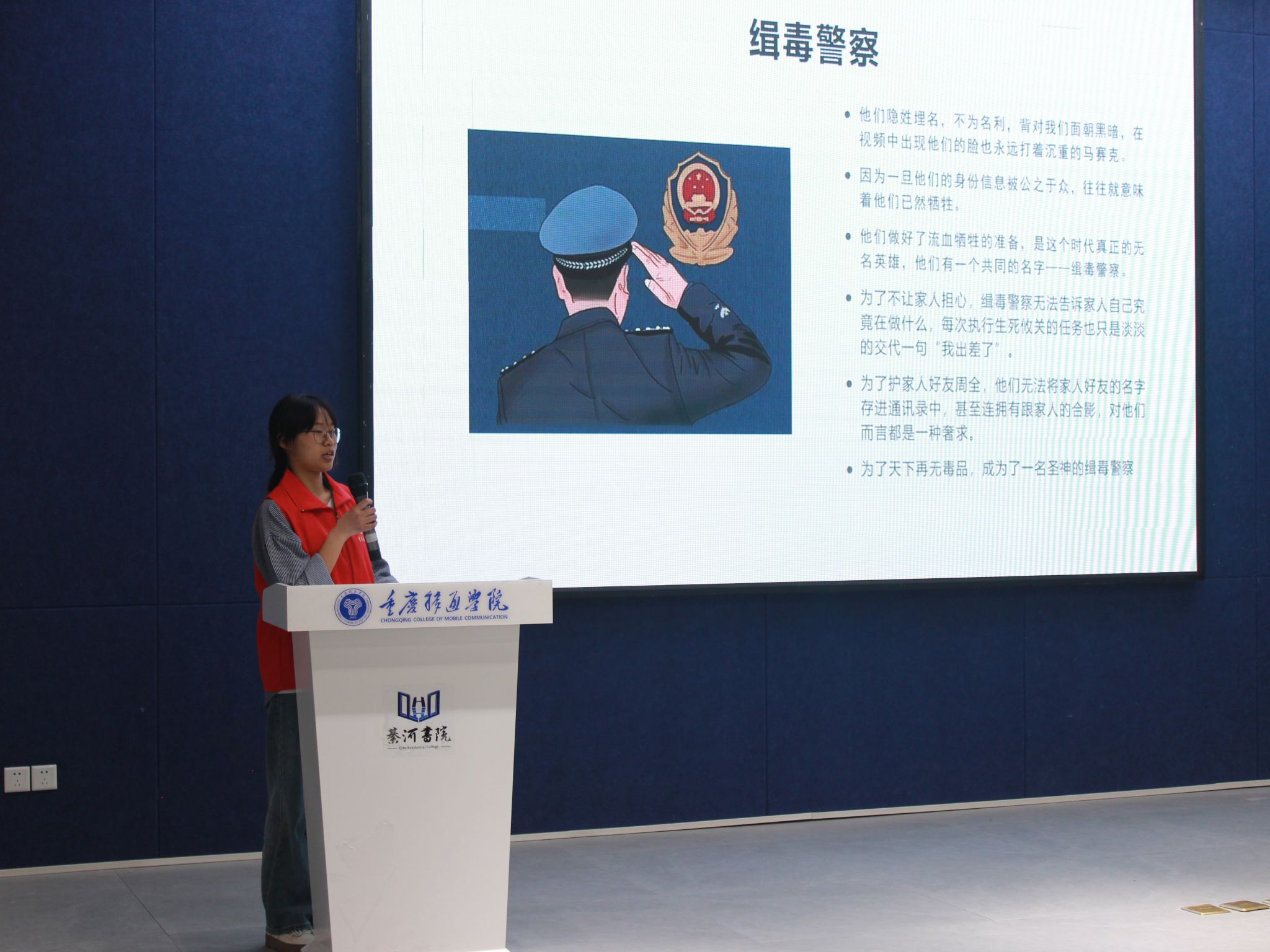 “在中国警界,有一种警察只能默默奋战在自己的岗位上,用鲜血和生命与毒贩生死搏斗、捍卫人民安全,保障一方安宁。”活动中,“e”心禁毒志愿服务专项支队宣讲员张郎玲向参与的同学们宣讲到,缉毒警察即便是被表彰,他们也不能出现在大庭广众之下,照片、视频也是被打满了“马赛克”,他们是我们的无名英雄。