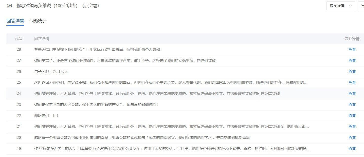 “禁毒的道路上需要我们的支持,我们不能忘记这些缉毒警察们的牺牲和付出。”禁毒支队的队员们对同学们号召大家共同携手,共同筑牢“拒绝毒品,对毒品说不"的共识。活动结束时,同学们纷纷扫描禁毒问卷调查的二维码,表达了对国家禁毒工作和缉毒警察的感悟,进一步筑牢禁毒思想防线。