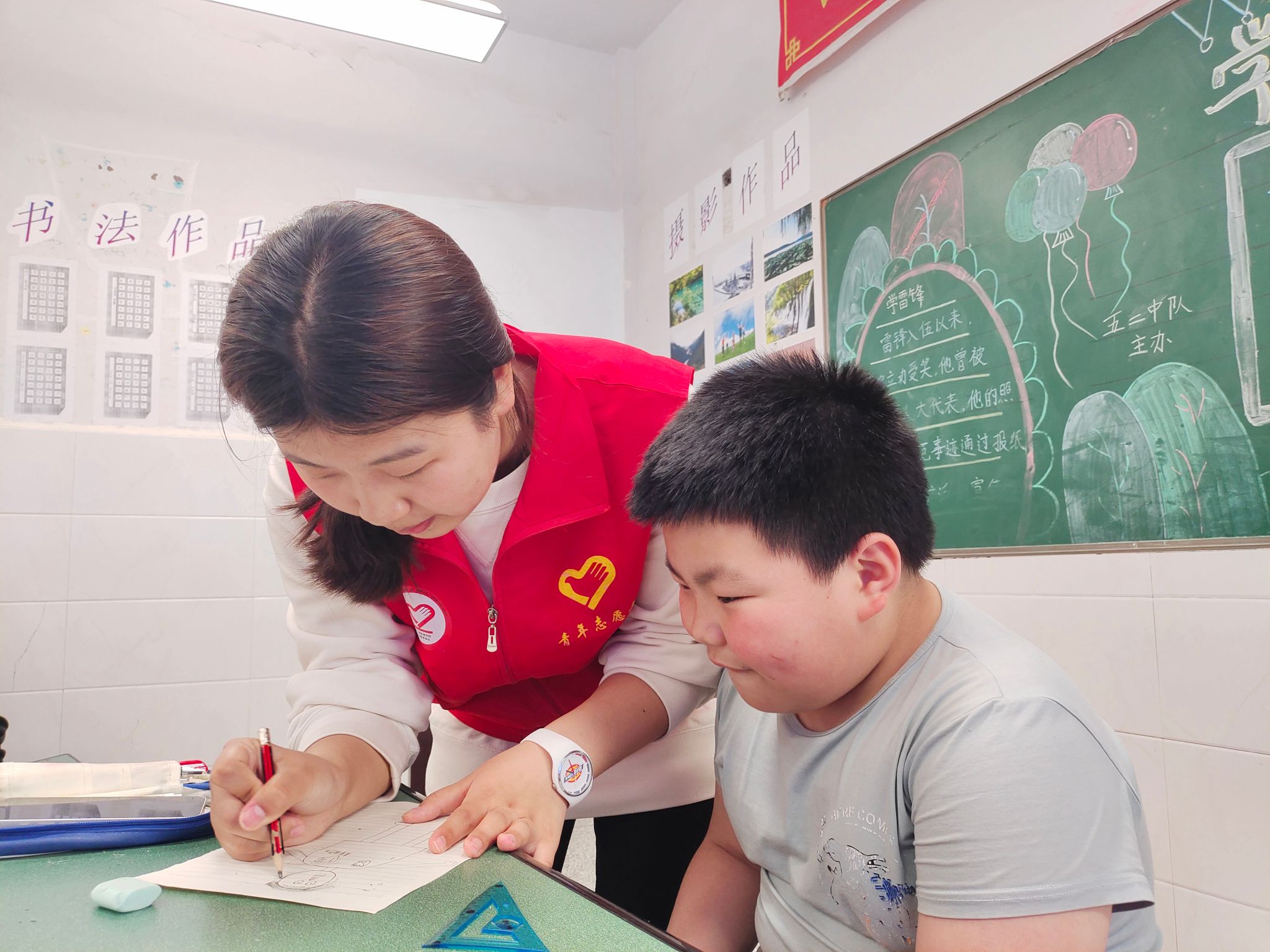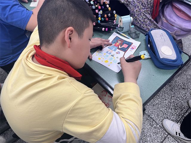 “姐姐,看我画的拖车、挖车、还有压路车,而且我家有很多的玩具车。”一个小男孩在画画途中主动将自己的画作介绍给志愿者,并拉着志愿者一起融入到充满童趣的画作当中。也有小朋友向身边的志愿者们求助,志愿者们耐心为小朋友们提供解决方案,为小朋友们讲述着自己的志愿服务故事,孩子们神情专注地投入创作,还不时回过头来问志愿者如何处理一些构图和色彩上的小细节。