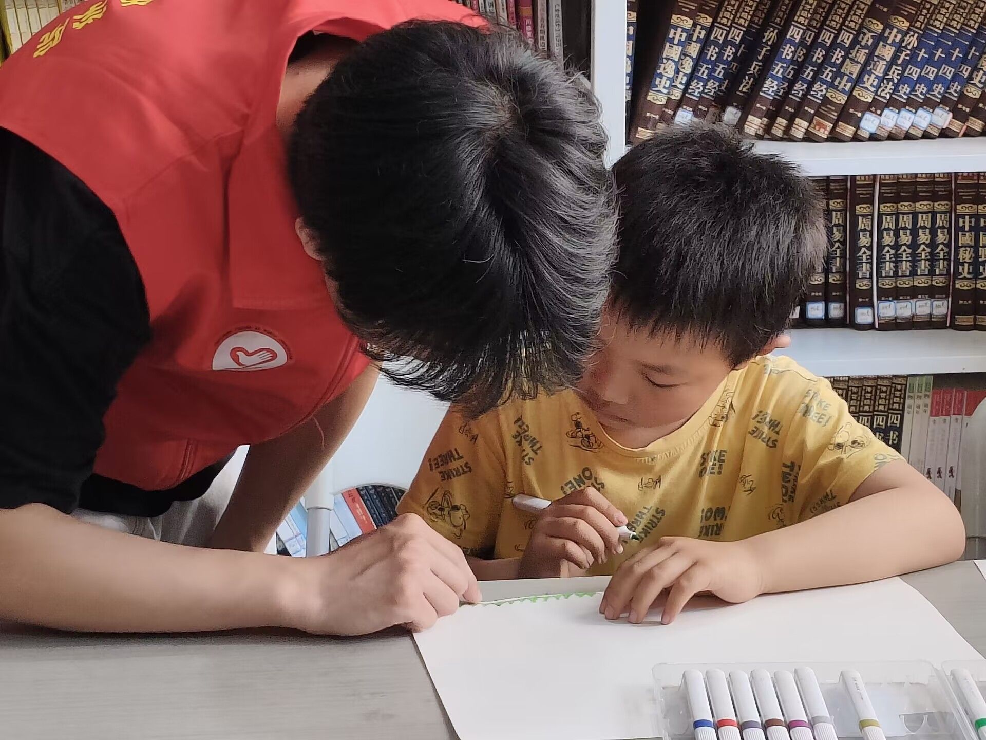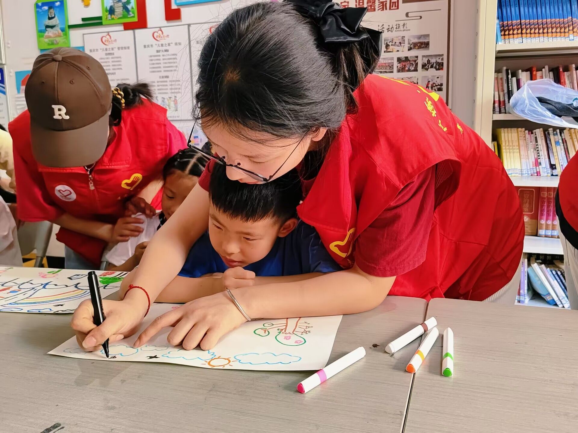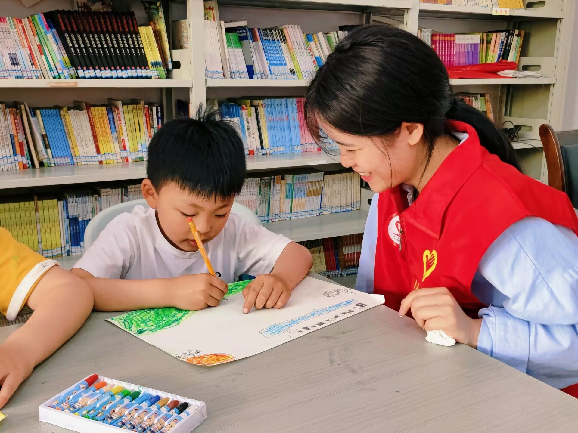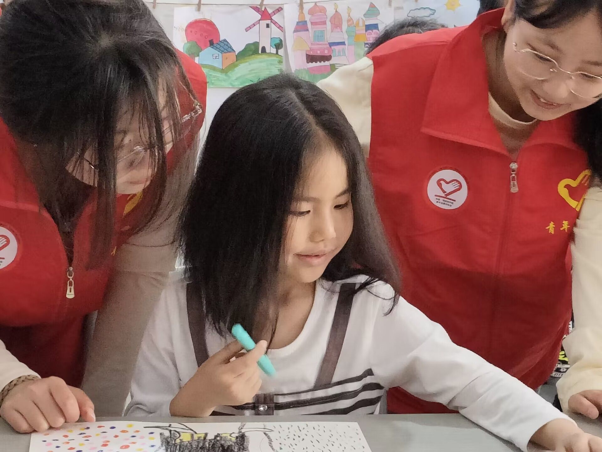 在活动中,志愿者们依次为小朋友们分发了画纸和铅笔,志愿者向小朋友们介绍了本次绘画的主题——画出自己眼中的春天。小朋友们仔细观察,认真描摹,用手中的画笔认真的勾勒着或粗或细的线条,笔下的图案逐渐成型。同时,志愿者们都会在旁耐心指导,俯身、躬腰做到捕捉小朋友们的每一个细节,为小朋友们提供绘画思路,讲述春天的特征性景物。而后,绘画到了上色环节,志愿者们会细声的询问小朋友们所需要的颜色、教小朋友们色彩搭配,与小朋友们一起互动填色将每个细节都做到无缝衔接。