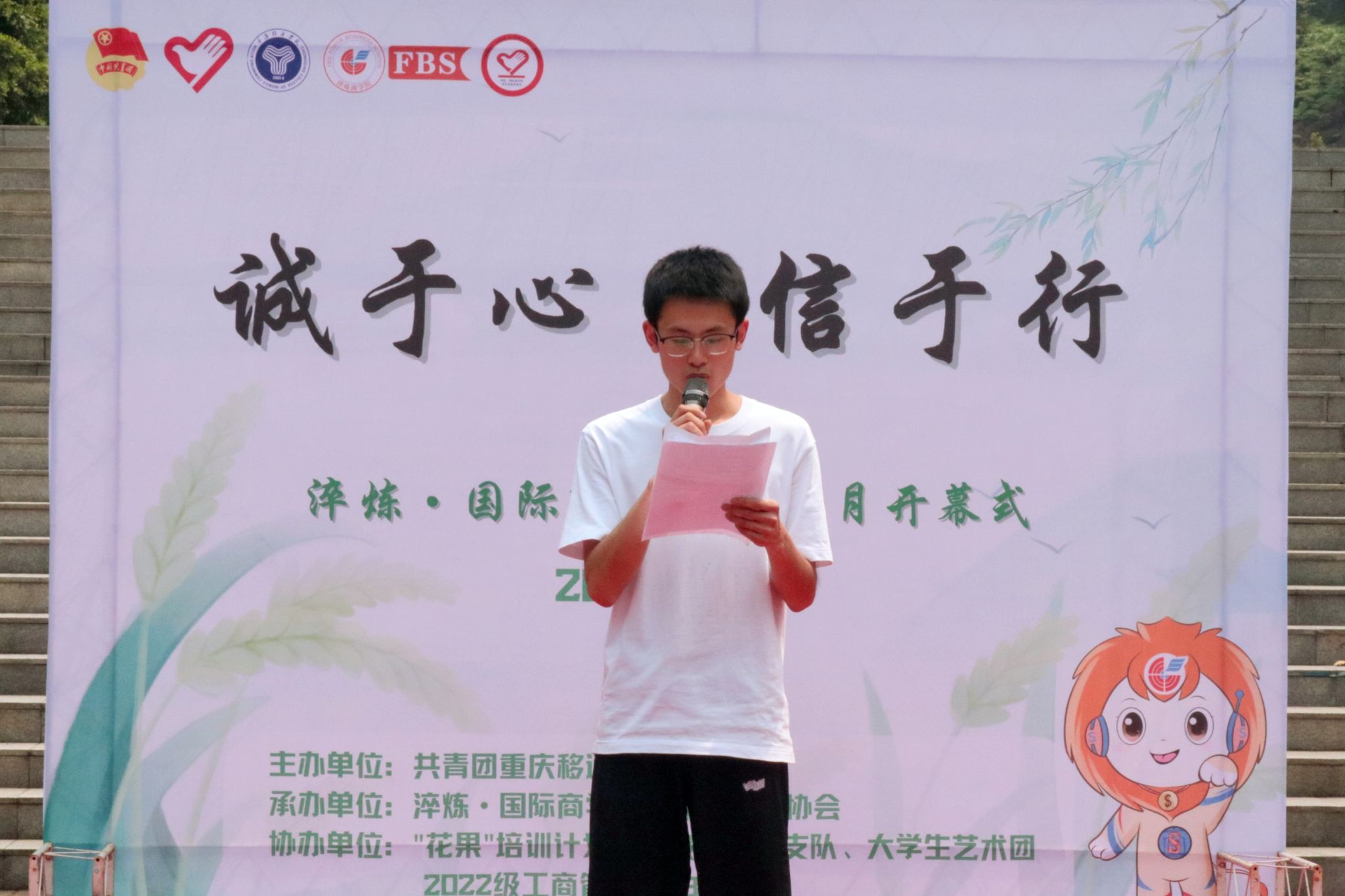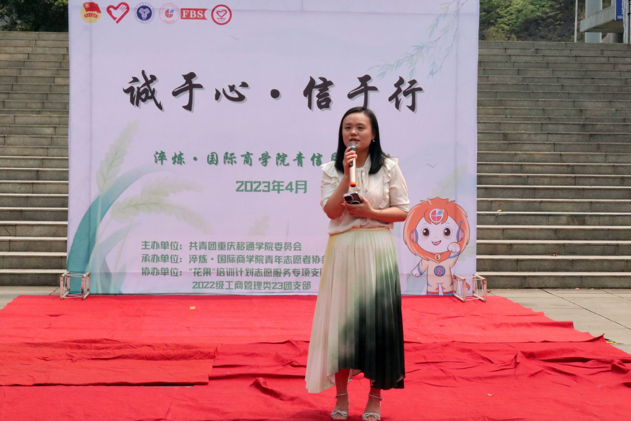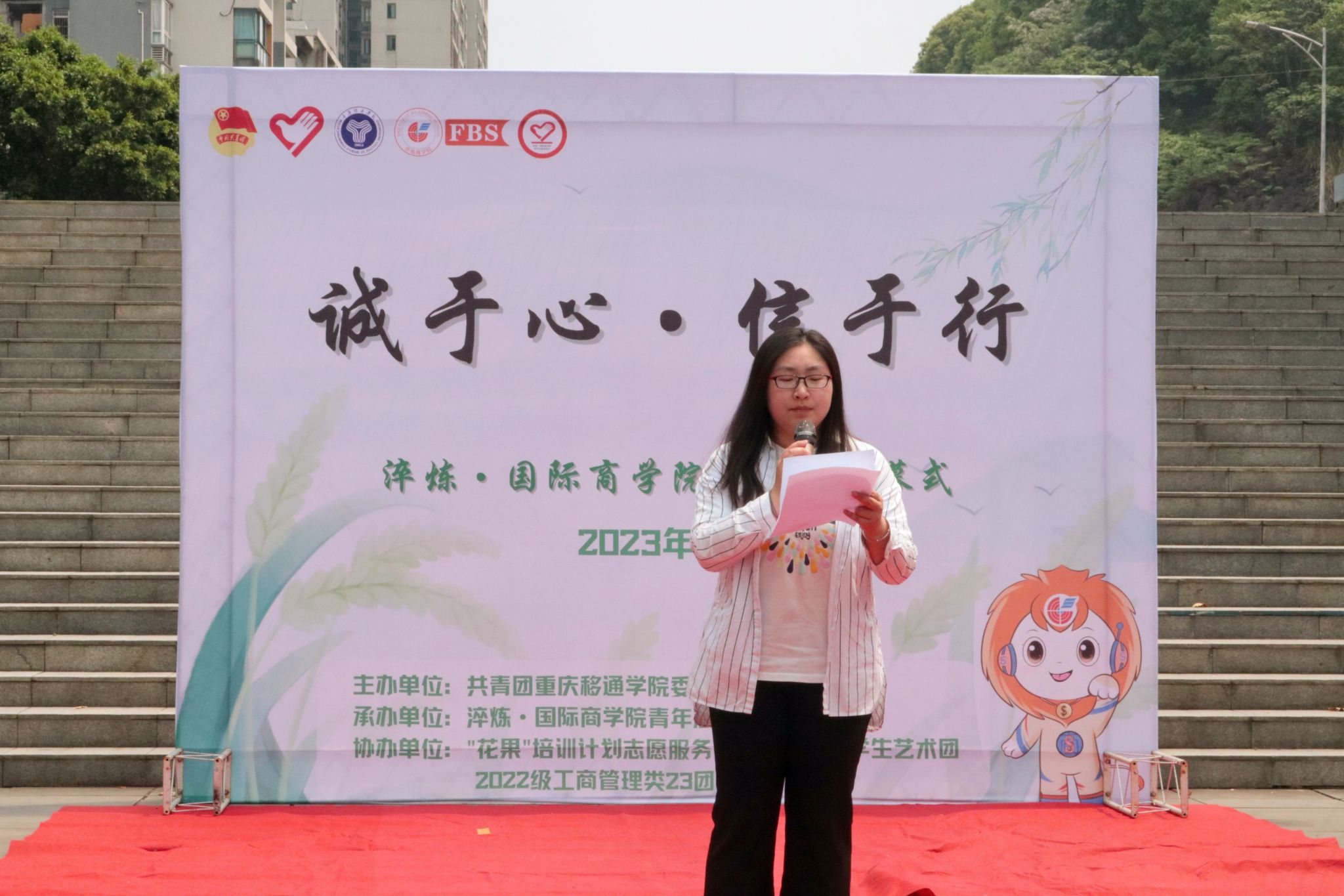 为提高移通学子的诚信理念,加强青年诚信教育,提高青年学子的诚信意识和道德素养,2023年4月17日淬炼·国际商学院青年志愿者协会于黄桷树广场开展“诚于心·信于行”青信月特色活动开幕式。淬炼·国际商学院学工副院长刘薇唯、就业创业办公室主任杨伦芳,青年志愿者联合会指导老师刘月、青年志愿者协会指导老师张鑫和完满观察团指导老师梅欢,基层班团志愿者代表等共计600余人参加了本次活动。