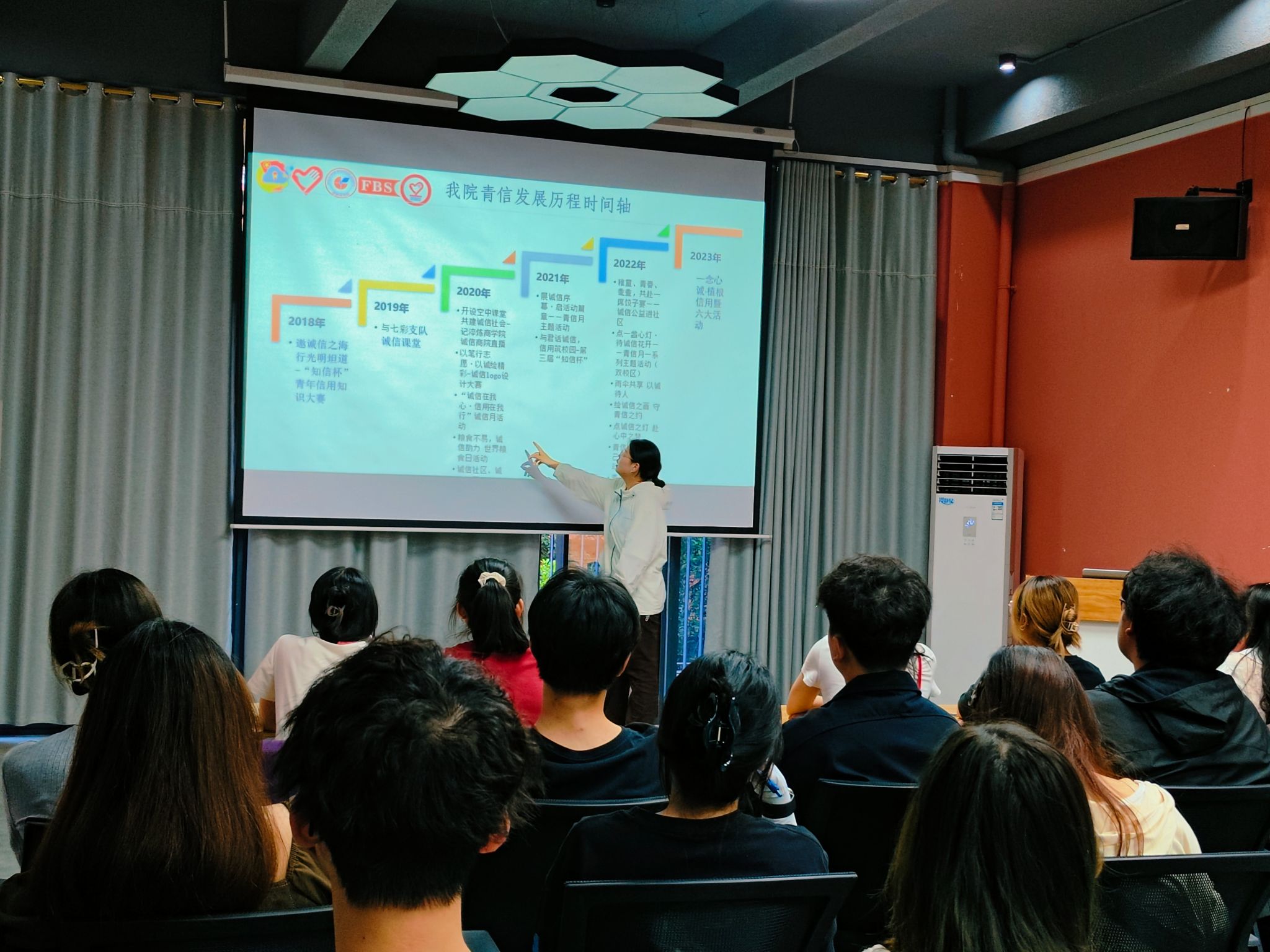 打破思维局限,拓宽活动形式,扩大活动影响力,深化活动内涵,是淬炼·国际商学院青年志愿者协会五年青信之路的初心与目标。青信信公约、青信各类设计活动、诚信售卖、青信知识竞赛、公益营销、图书驿站、诚信雨伞、青信帆布袋等都是其生动体现。通过两位宣讲人的讲解,大家明确了诚信商院的发展之路,看见了其内部的构造与走向。诚信商院需要商院学子共同努力,一起为诚信商院的建设与完善奉献出自己的力量。
