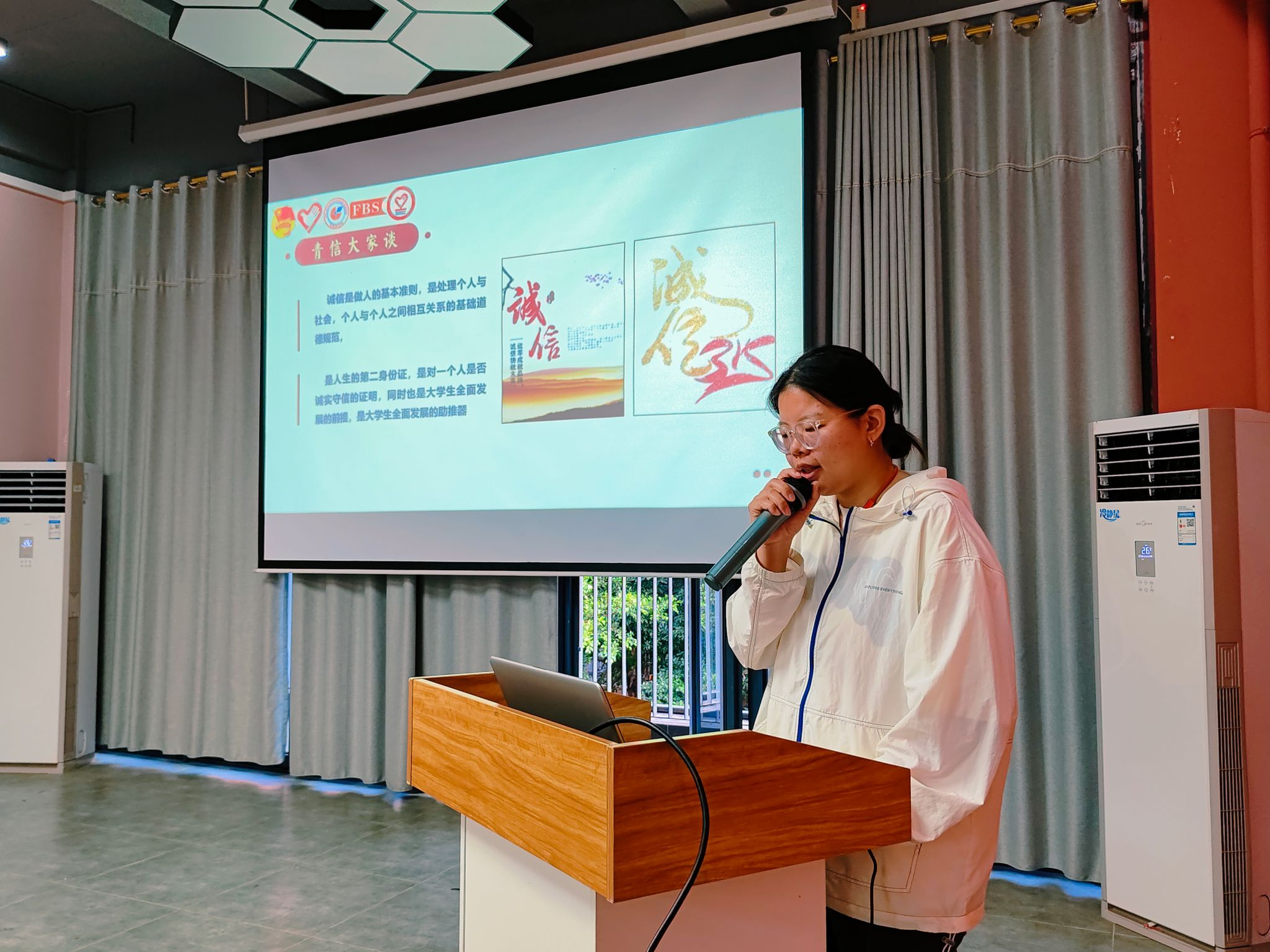 青年信用体系建设是社会信用体系建设的重要组成部分,是广大青年践行社会主义核心价值观的制度化载体,是共青团深化改革,引领和服务青年的重大创新举措。本次培训,主要从青信大家谈、诚信商院建设、诚至金开这三方面进行宣讲。从青年信用体系的内涵与升华开启了培训宣讲的序幕,细致的理论讲述将青信系统地完整地呈现出来。