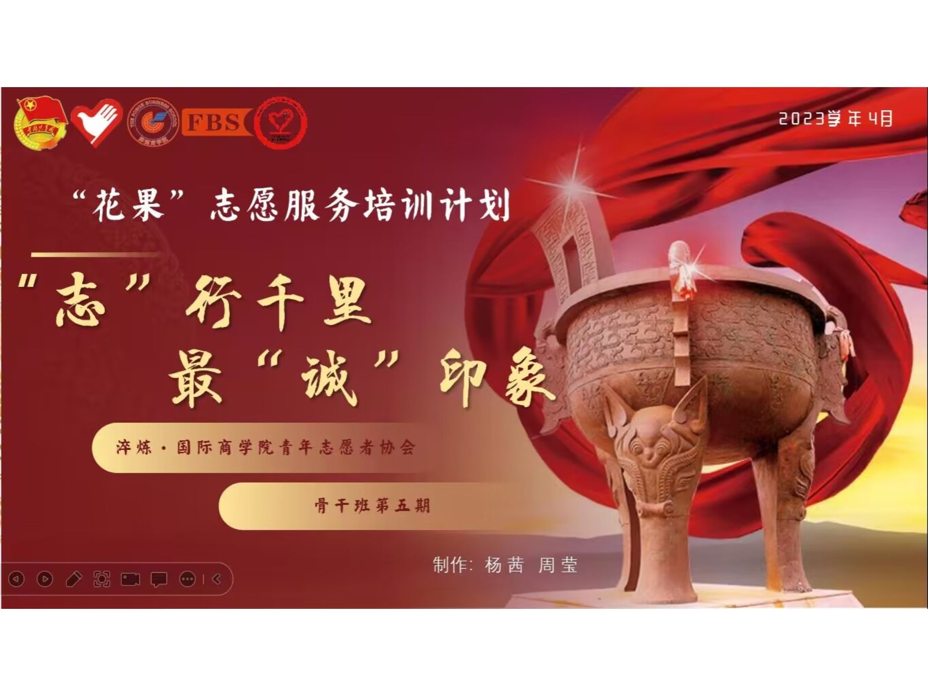 诚信为本,操守为中,坚持原则,决不做假。为进一步强化青年信用体系的建设,完善诚信商院体系,提高商院学生的诚信意识。淬炼·国际商学院青年志愿者协会和2020级工商管理类8班、财务管理3、5班于2023年4月19日下午于双校区联动开展了“花果”志愿服务培训基础班第五期活动。此次培训合川校区主要由淬炼·国际商学院青年志愿者协会分管主席王若凡对2022级、2020级各班团支队长及2022级工商管理类23班全体同学进行培训,綦江校区主要由淬炼·国际商学院青年志愿者协会社会实践部部长杨茜对2021级各班团支队长进行培训宣讲。