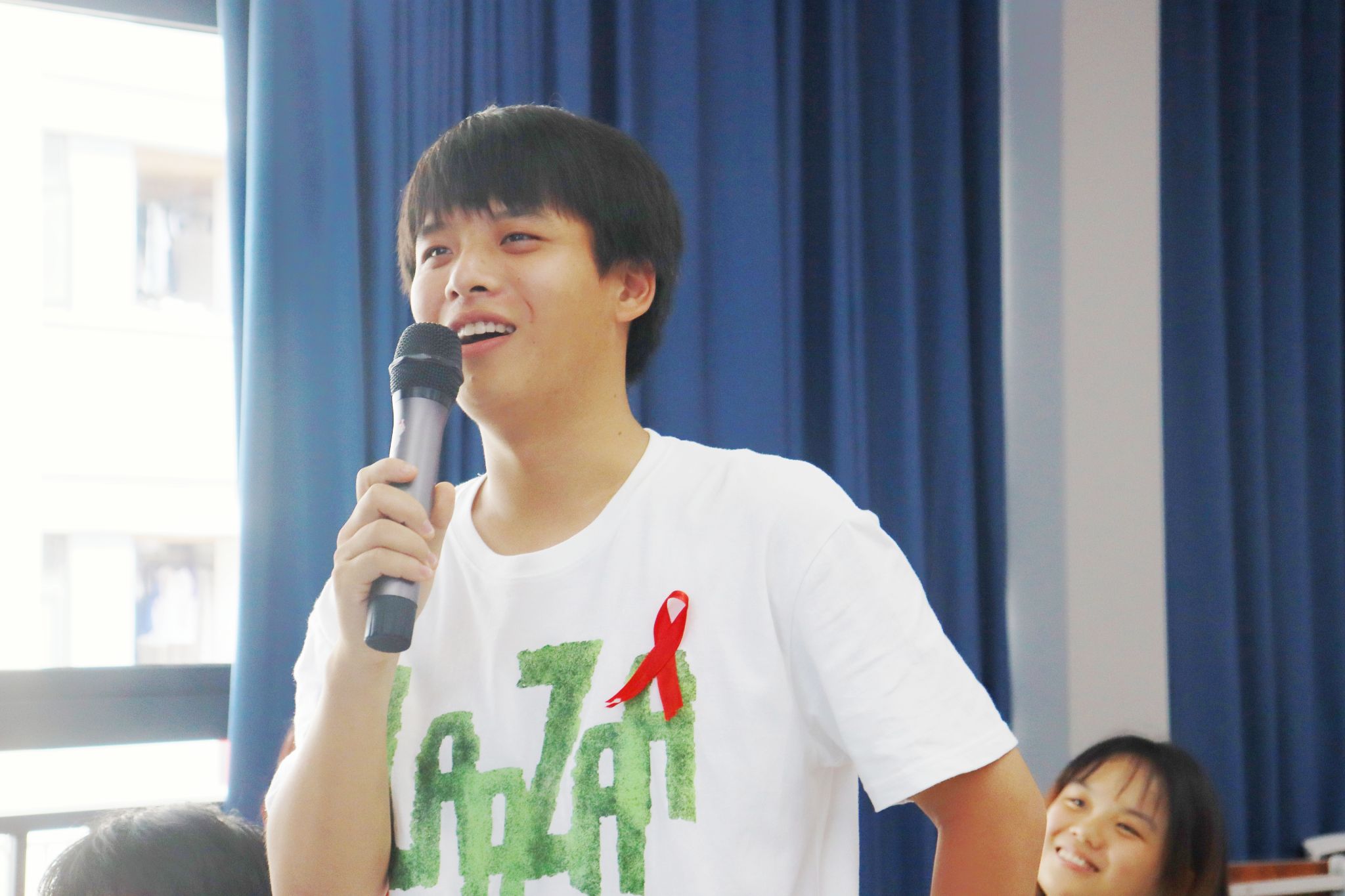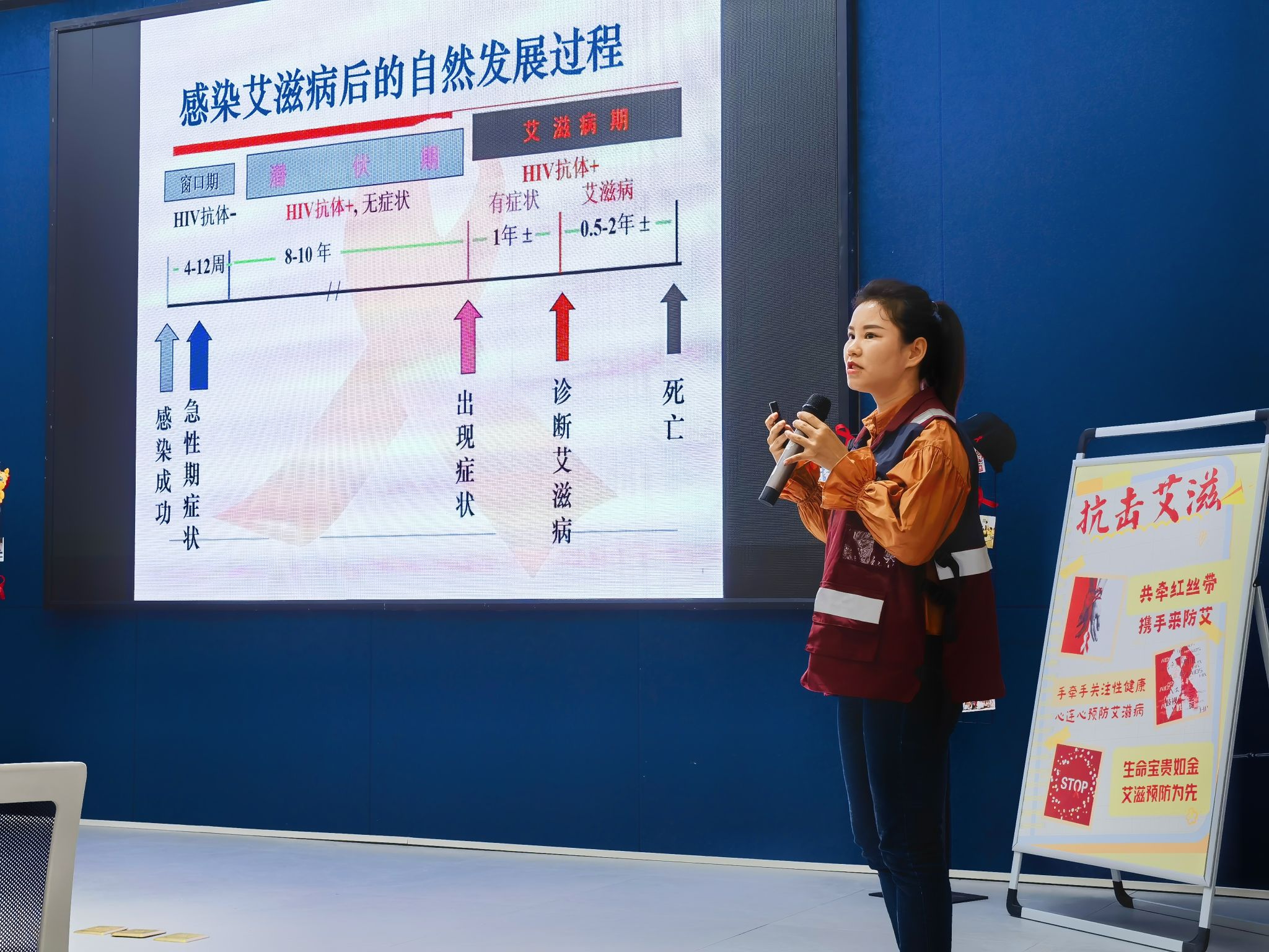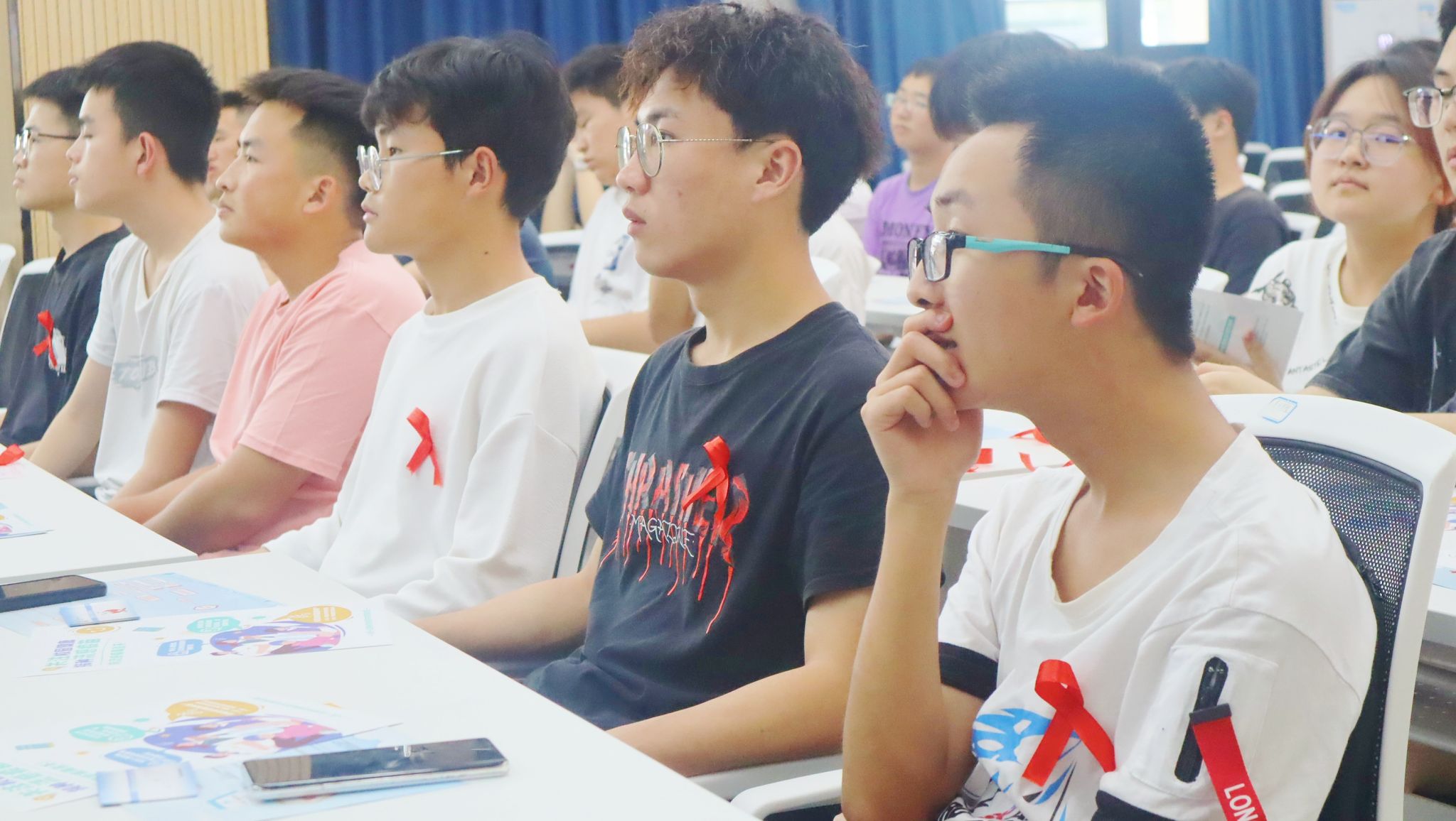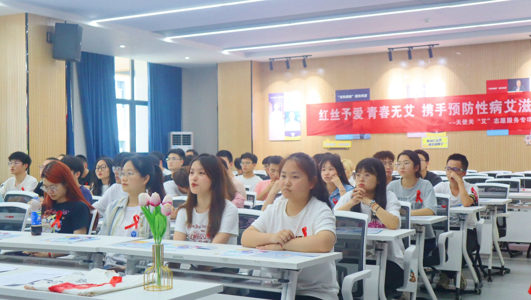 “请各位同学将桌上的红丝带整理好,佩戴于胸前,跟随我走进艾滋病防治的世界。”活动伊始,主持人隆佳丽同学告诉大家,在现场的桌上,粘贴着象征着防艾关艾的红丝带,佩戴完毕后代表着宣教活动正式开始。