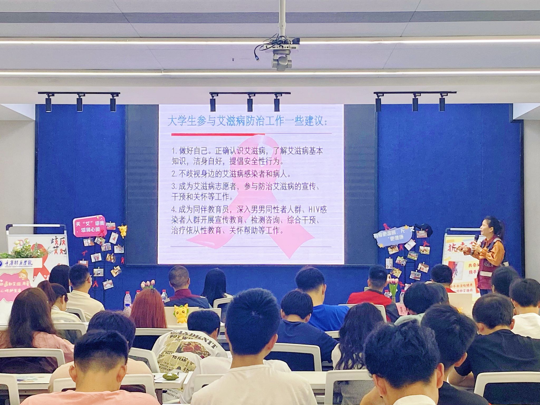 “同学们,你们是祖国的花朵和未来,觉得艾滋病离我们远吗?”在綦江区疾病预防控制中心周烨老师的宣教中,她告诫青年大学生要正确认识艾滋,逃出“艾滋病很远”的误区。她通过展示我国和当地的艾滋病数据,呈现艾滋病患者的图片,结合艾滋病的流行特点、传播途径、预艾方法、防治政策、艾滋病危害、大学生参与艾滋病防治工作建议等方面进行了讲述,给大家带来极大的震撼并留下了深刻的印象。