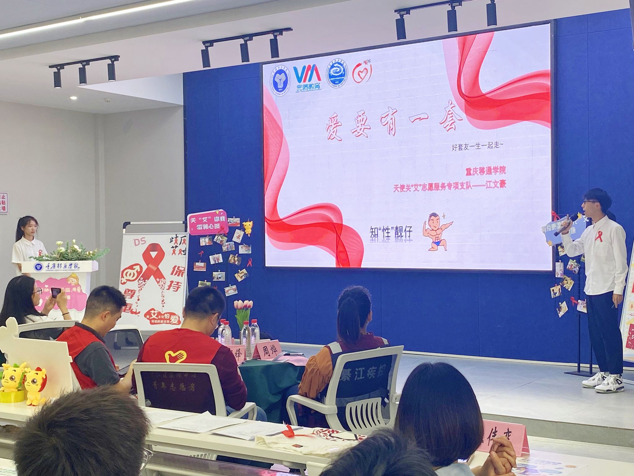 活动荣幸地邀请到了大数据与计算机科学学院副院长王焱老师、学工办主任阙小梅老师和志愿服务相关指导老师出席。特别邀请到了綦江区疾控中心副主任陈明亮一行,来到活动现场开展防艾宣教和指导。