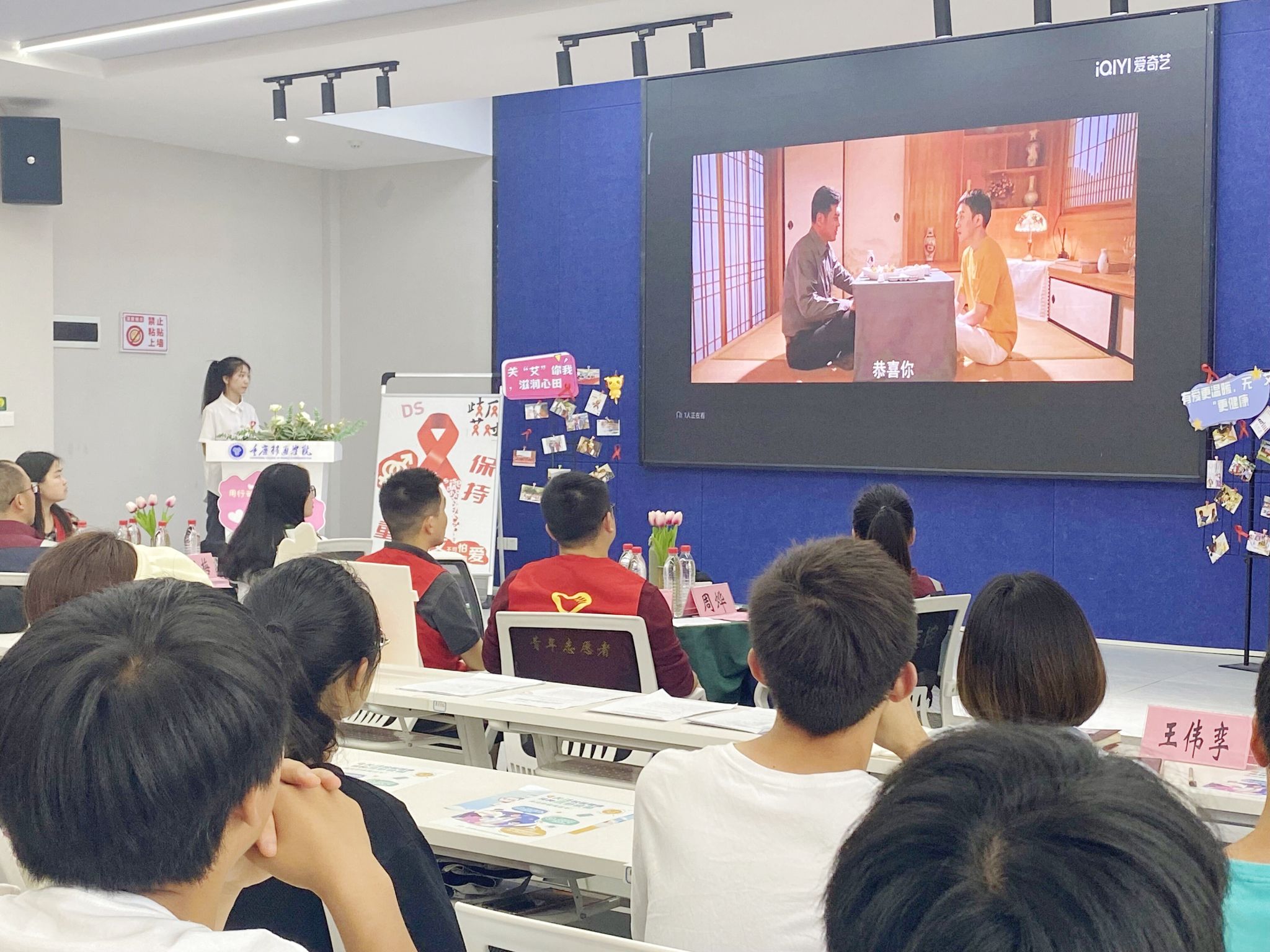 “在我国,性途径传播已经成为艾滋病主要传播途径。近年来,青少年艾滋病感染疫情持续上升。”集中观看防艾微电影是活动的第一个环节,在中国性病艾滋病防治协会摄制的青少年感染艾滋病警示微电影《一生所艾》里,整部影片讲述了主人公因无意识,被迫加入“艾滋病俱乐部”,面对被感染事实,对家庭和个人带来了沉重的伤害,同学们也深深被震撼到。
