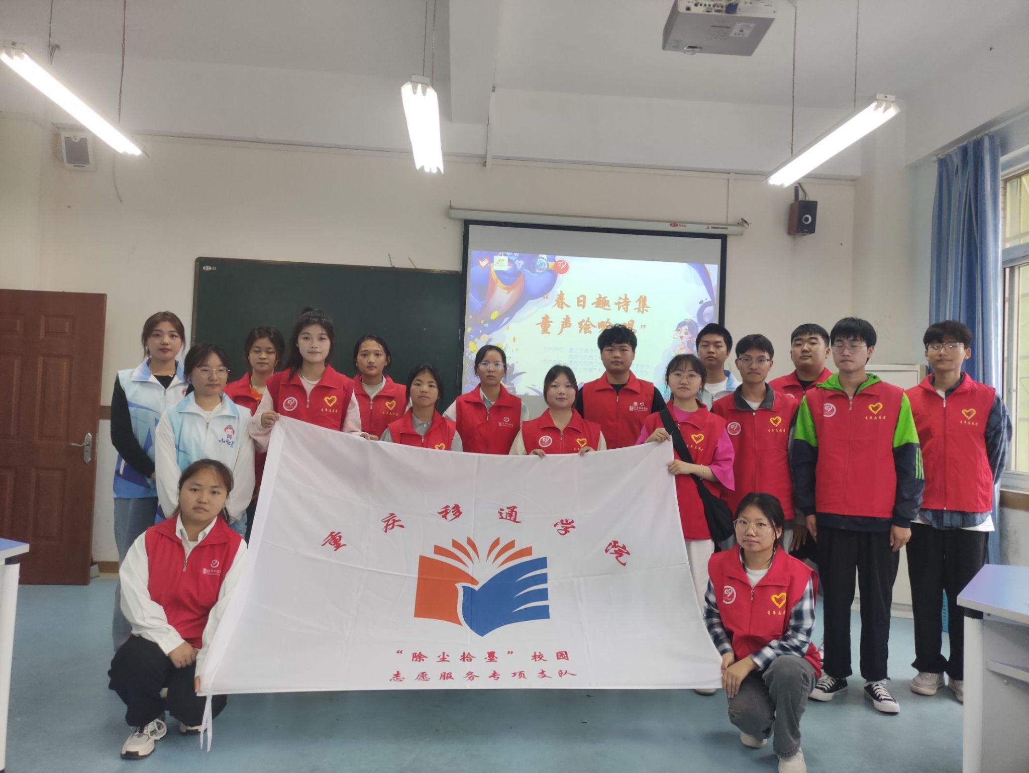 为了响应第28个世界读书日号召,发展和激发同学们的读书兴趣,通信与信息工程学院青年志愿者协会和“除尘拾墨”校园志愿服务专项支队联合綦江区青少年活动中心于4月22日15:00开展了“春日趣诗集,童声绘吟唱”活动。此次活动由通信与信息工程学院青年志愿者协会指导老师邓艳老师和周靖鱼老师带队。