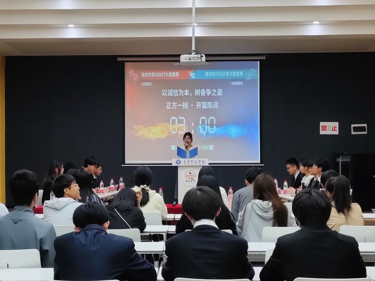 此次决赛辩题——诚信的行为更重要还是意识更重要。辩论一开始,正方就提出诚信的意识比行为更重要的观点,意识决定行为,意识是人类社会发展的先导,它是人类实践的反映和指南,是行为的内在动力,意识决定行为的质量和方向。一种好的意识形态可以引导人们进行高水平、高质量的实践活动,而一种错误的意识形态则可能引导人们走向错误的方向,并举出生活中的例子,当今社会更多的人会因为自己的意识先存在而后再去践行。反方则提出一个人的行为比意识更重要,他们认为行为是社会活动的基本形式,是实践的过程和结果,意识只是行为的后期产物,行为的效果直接影响着社会历史的进步和发展。如果没有正确的实践行动,意识就没有任何意义。行为是评判一个人的标准,比如说在市场经济中,只有成功的行为才是最重要的,这行为是社会活动的基本形式,是实践的过程和结果,意识只是行为的后期产物.通过现代社会的垃圾分类来论证人们看到垃圾桶就会自觉扔掉垃圾,而这一行为并不是意识决定的,是人们自身先天就有的行为。在攻辩环节,正方首先向反方提出问题,但反方并没有被正方气势压迫住,反而从容自若,口若悬河,双方都各据一势。在自由辩论环节,双方辩手都通过分析,引证权威,展现出高超的口才和思辨能力,全神贯注地为自己的主张辩护,群儒唇枪舌剑,字字胜过珠玑,句句惊为天人,时而诙谐幽默,时而引人深思。选手们雄辩滔滔、妙语连珠,台下观众凝神聆听、掌声不断,可谓是精彩纷呈啊!
