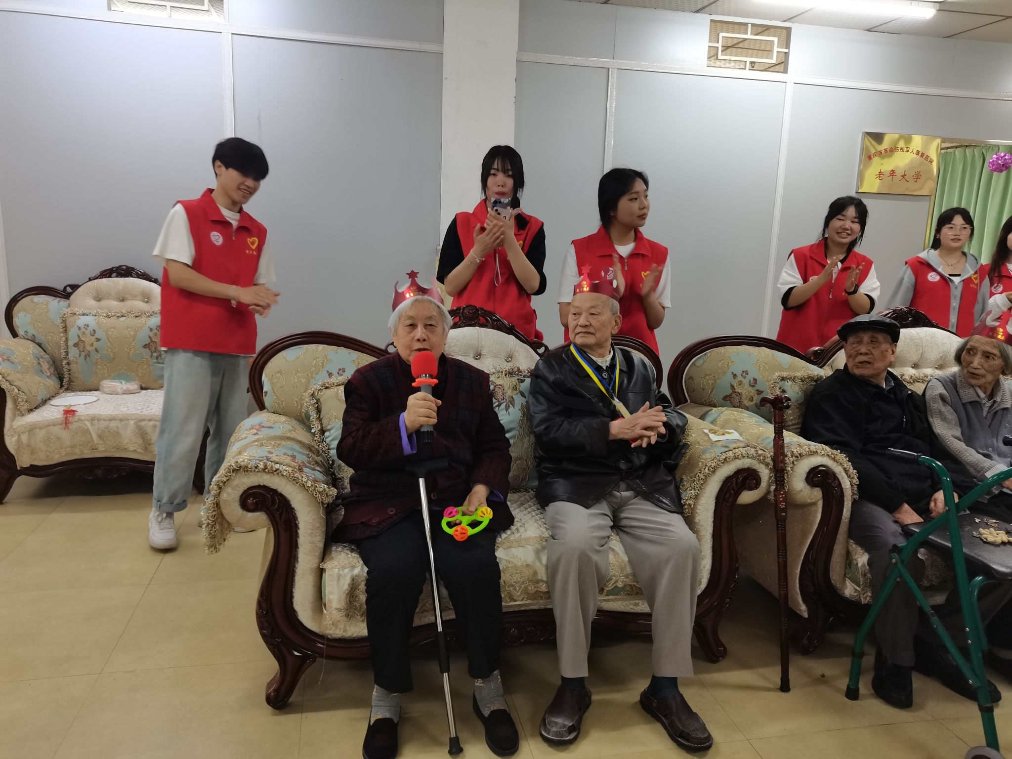在生日会现场,为了活跃气氛,志愿者和长辈们还欢快进行了小游戏。“击鼓传花”紧张又刺激,随着音乐响起,老人们一个接一个的传递着手中的“花”,第一轮游戏结束,89岁的冯爷爷“当选”。爷爷随后认真分享了自己的想法,说道:“年轻的时候都没怎么过过生日,到了荣军院后这样的集体生日每年都有,既新鲜又富有创意,很热闹,很温馨,感谢党和政府,感谢大学生们不辞辛苦的为我们过生日。”第二轮游戏在紧张的音乐声中持续进行着,卢婆婆手忙脚乱的想把手中的花递给下一位老人,音乐却在此时停止,卢婆婆也不扭捏,接过话筒唱了一首《怎么快乐怎么过》,在场的其他长辈和志愿者被卢婆婆可爱的动作逗得开怀大笑。游戏环节结束,荣军院社工为两位“当选”老人送上了精心准备的小礼物。