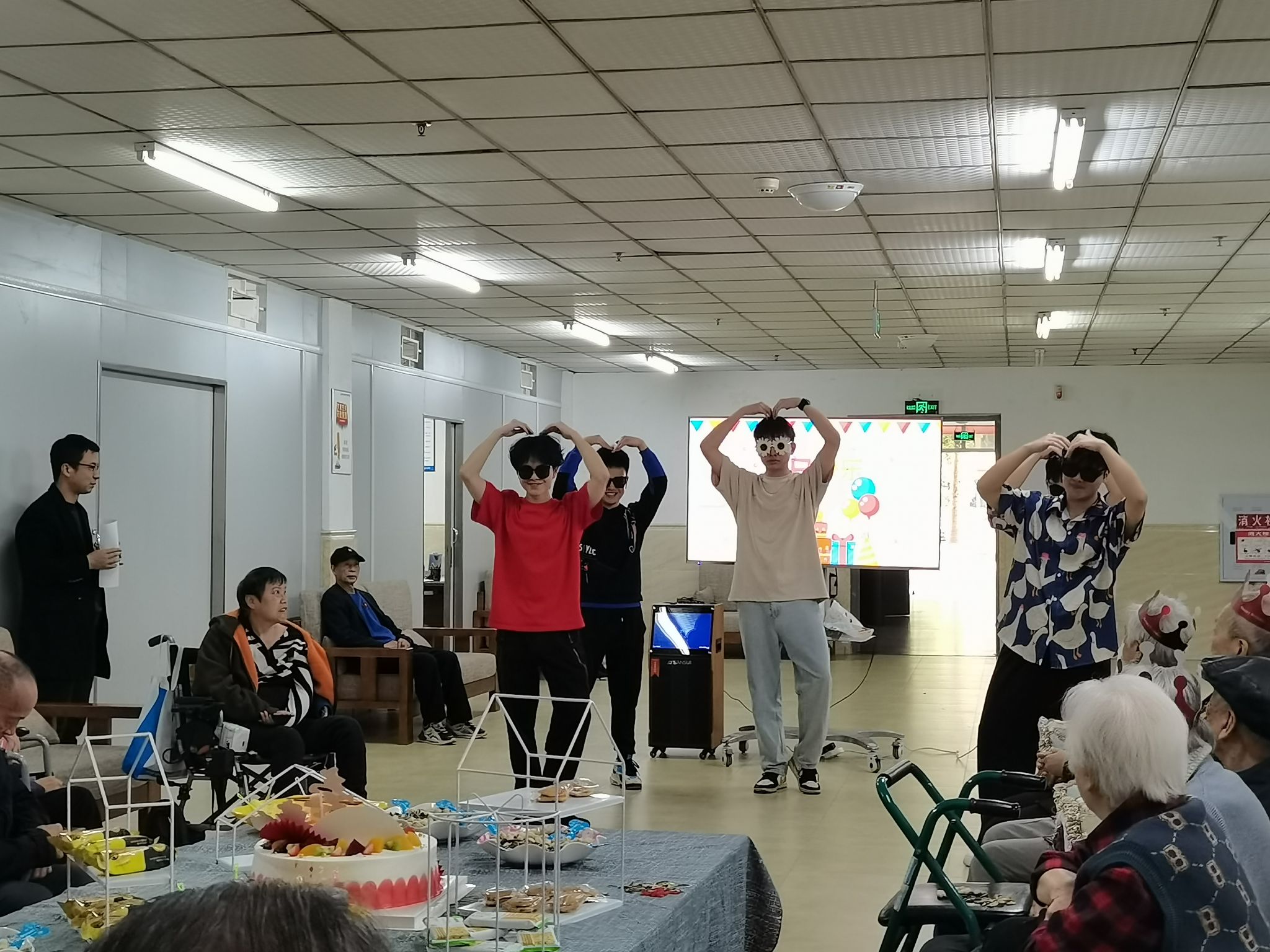 下午三点,老兵支队志愿者准时来到荣军院,在播放着欢乐音乐的生日会场里,认真布置着场地。生日会场的桌上摆满了志愿者和社区工作人员精心准备的水果和零食,冯爷爷、卢婆婆等十来位老人满怀喜悦地围坐在一起,等待着生日会的开始。活动在荣军院领导的致辞中拉开帷幕,代表发言人员真诚祝愿了在场长辈们健康长寿,希望他们能够乐享晚年,同时也表达了对工作人员和志愿者的感谢。随后老兵支队志愿者为老人们带来了舞蹈表演《烟雨行舟》、《小城夏天》《失恋正线联盟》以及歌曲大合唱《我和我的祖国》,跳跃的音符演奏着青春的活力与朝气,这是一场青春与夕阳的碰撞,长辈们掌声不断、喜笑颜开,现场氛围融洽极了!
