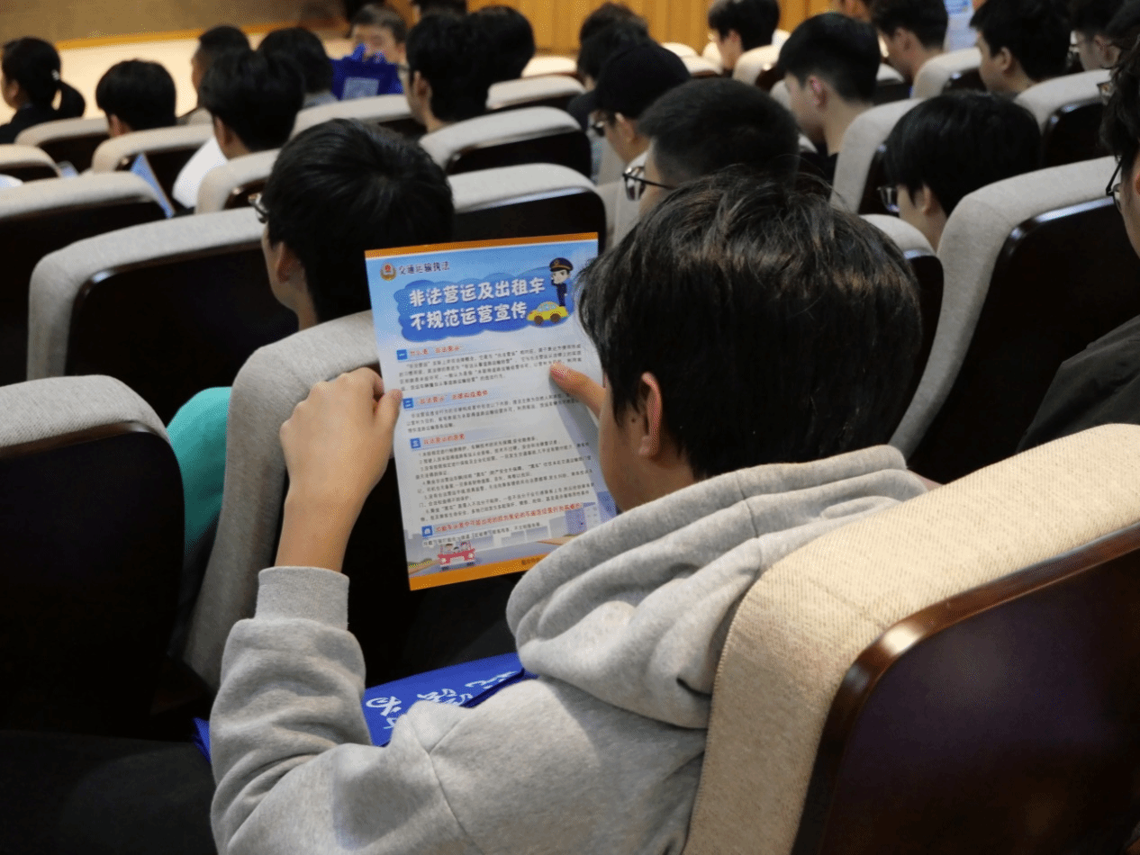 普法宣讲吸引了广大师生的关注。重庆市合川区交通运输综合行政执法支队的曾亚洲科长向同学们讲解了交通运输的概念、交通运输法规以及生活中常见的违反交通运输法规的现象,并围绕什么是“黑车”、为什么拒乘“黑车”、出租车、网约车具体违法违规行为有哪些等问题进行展开说明,现场也讲述了非法营运的危害性、违法性。曾科长也围绕真实案例,告诫同学们在生活中如果碰到此类现象可以拨打96096投诉电话进行反映,并提醒同学们注意投诉或者举报的时间、地点、车牌号、司机姓氏等问题。