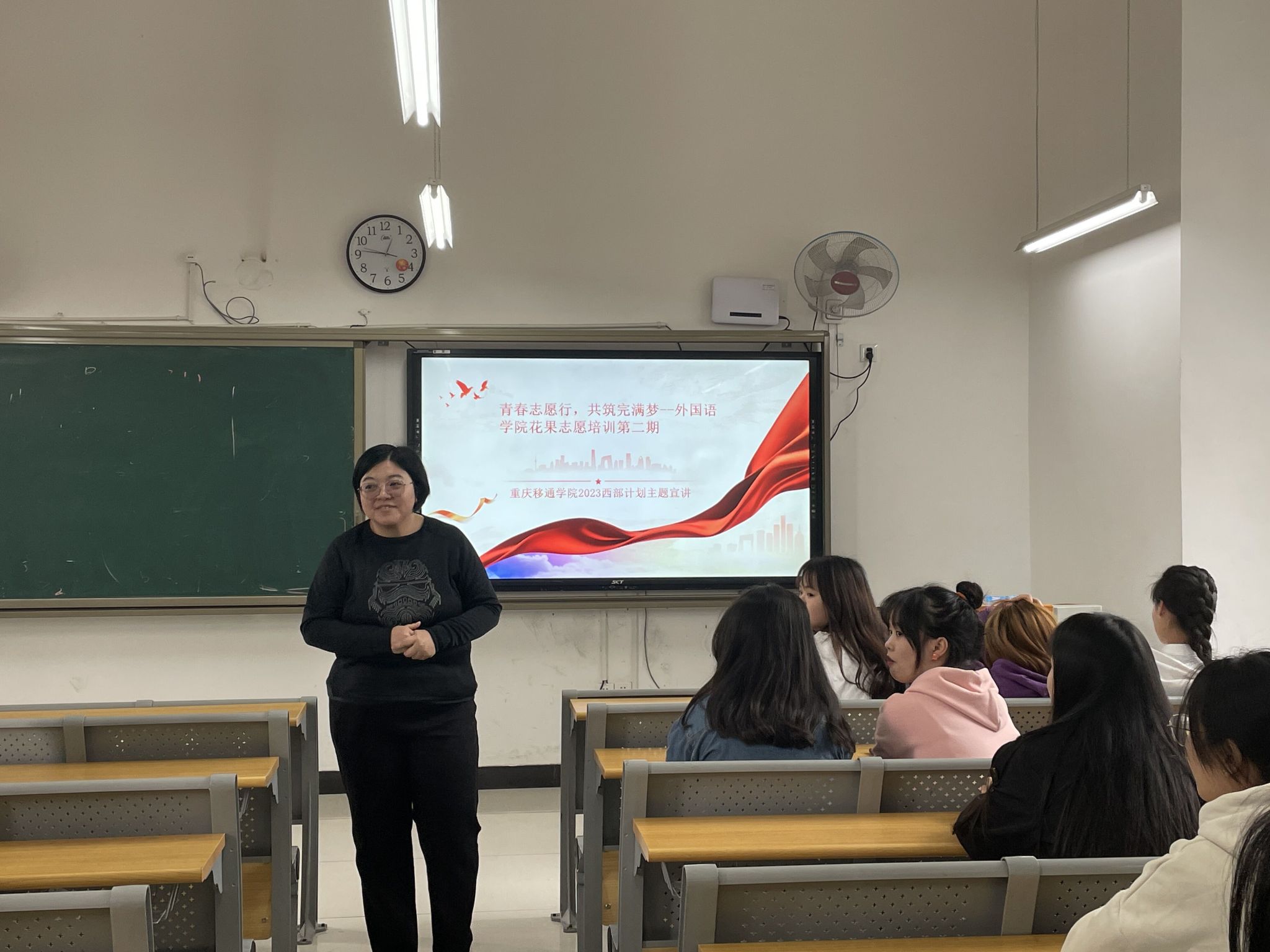 为响应我校2023年西部计划相关工作,进一步扩大影响,突出其显著的影响,广泛动员我校应届毕业生报名参与,用志愿为就业赋能,引导移通学子踊跃投身西部建设,外国语学院青年志愿者协会于4月26日16:00在天渠106开展了“青春志愿行,共筑完满梦——外国语学院花果志愿培训第二期”之重庆移通学院2023西部计划主题宣讲活动,本次宣讲活动邀请到外国语学院老师纪治阳老师进行宣讲授课,协助大家解决报名西部计划疑虑。