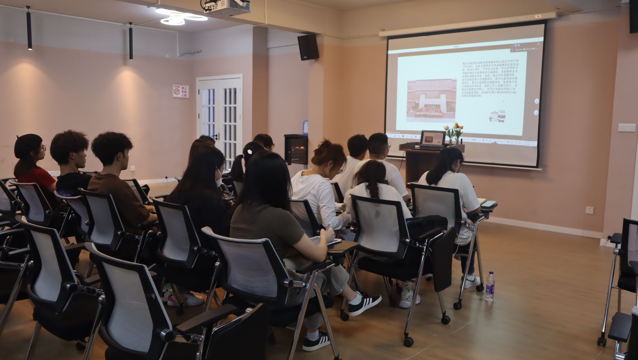 青影志愿服务中心机构理事长罗仁希、万梓豪同学,大数据青协干部与淬炼青协干部参加了此次会议。会议开始首先由淬炼国际商学院青年志愿者协会部长杨茜同学讲述了淬炼青协以“1246+”的模式开展志愿服务,通过一张张有价值,有纪念意义的活动照片展现了志愿服务的风采和志愿精神,同时也分享了淬炼青协在做志愿服务中的心得体会和实践经验。