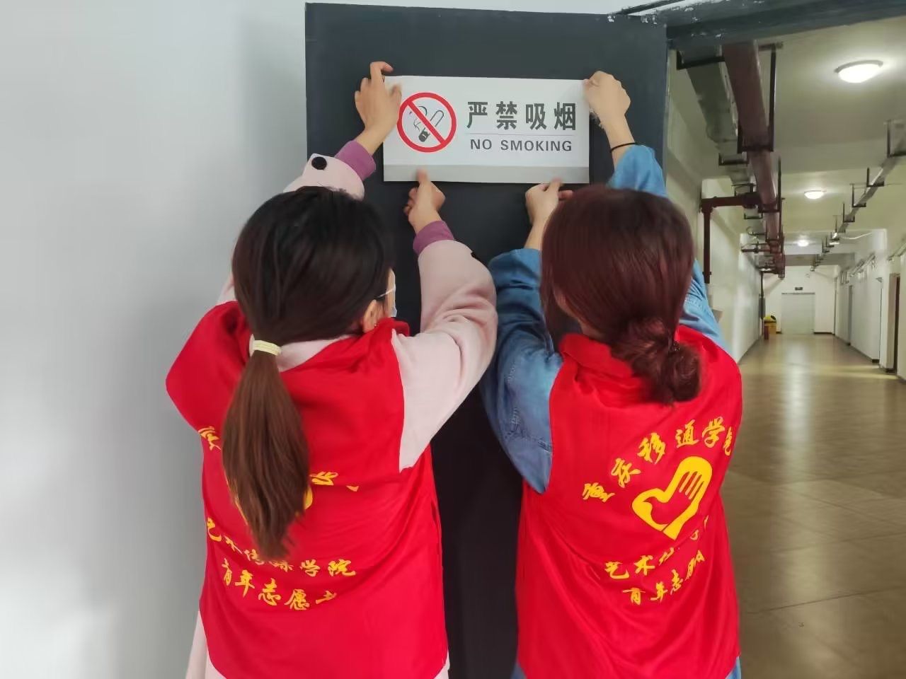为积极创建无烟校园,展现我校学子良好的精神风貌,营造文明、洁净、优美的校园环境。艺术传媒学院青年志愿者协会切实做好大学生“禁烟控烟”主题教育活动,四月也是禁烟控烟主题月,在第八教学楼开展了“以身为范,禁烟控烟”系列志愿服务活动,通过志愿者定期楼道巡逻、观看影片、微电影短视频等形式,进一步增强同学们的禁烟控烟意识,响应我校志愿服务完满板块。