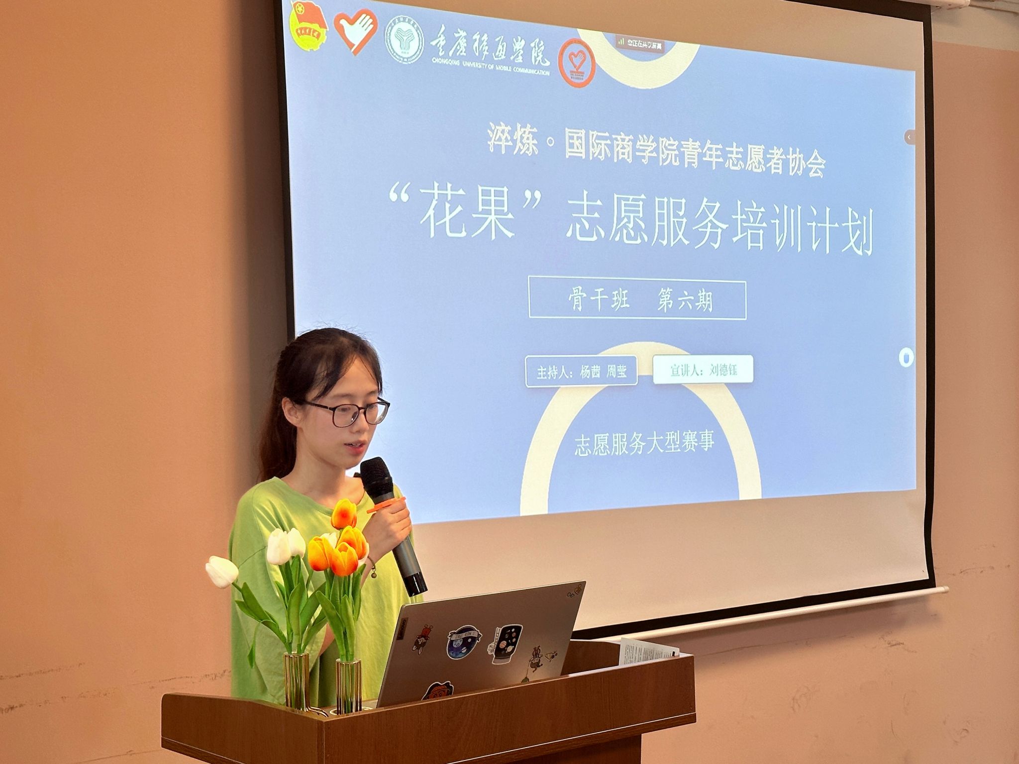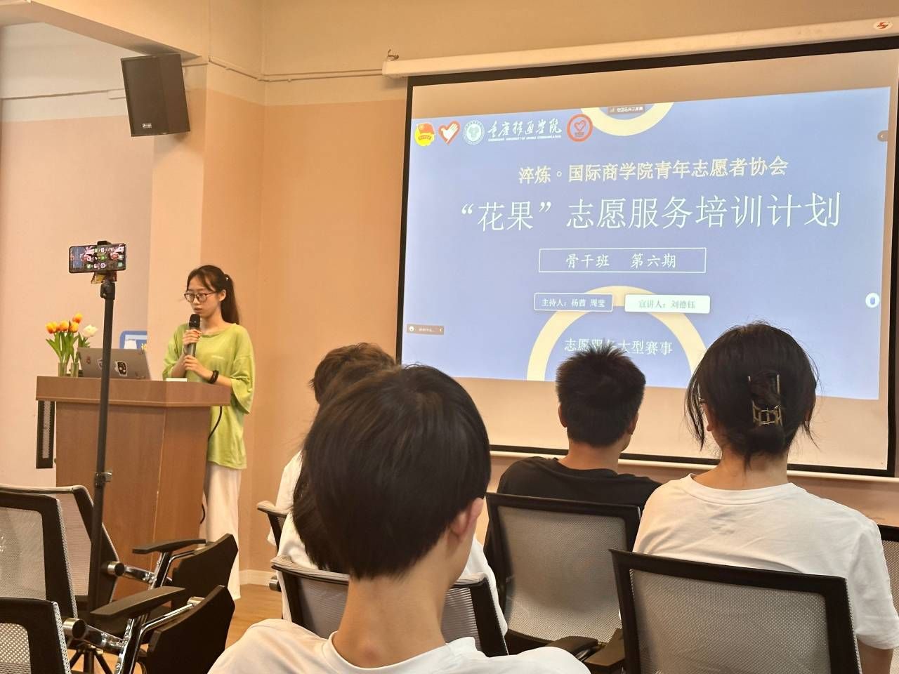 锚定花果目标方向,促学志愿理论要素。为强化基层志愿的骨干力量,优化志愿服务技能培训,淬炼·国际商学院青年志愿者协会于2023年5月5日中午开展了“花果”志愿服务培训计划骨干班第六期,此次培训以大型赛会的志愿服务为主题,由淬炼·国际商学院青年志愿者协会干部杨茜主持,特邀重庆移通学院青年志愿者联合会綦江校区的志愿骨干刘德钰作相关分享。淬炼·国际商学院21级、22级班团负责人以及部分青协干事参与本次培训,双校区联动加持,共创精彩。