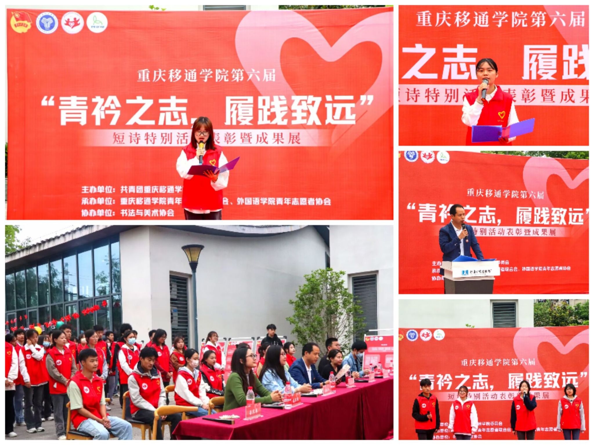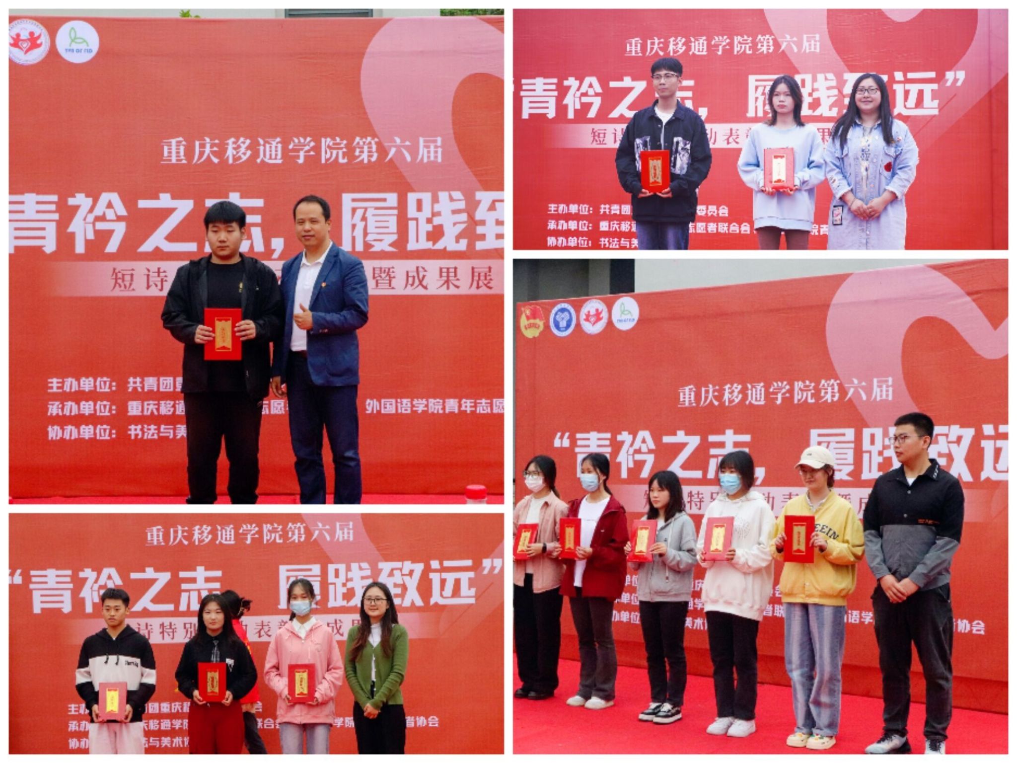 正值五四青年节之际,为大力弘扬“奉献、友爱、互助、进步”的志愿精神,不断加强和完善移通学院志愿服务体系建设,切实发挥志愿服务在学校的发展和构建和谐校园与社会中的积极作用,由校团委、校青联、外国语学院青年志愿者协会、书法与美术协会共同举办的重庆移通学院第六届“青衿之志,履践致远”短诗特别活动颁奖暨成果展于2023年5月10日下午16点在天渠书院火热进行。