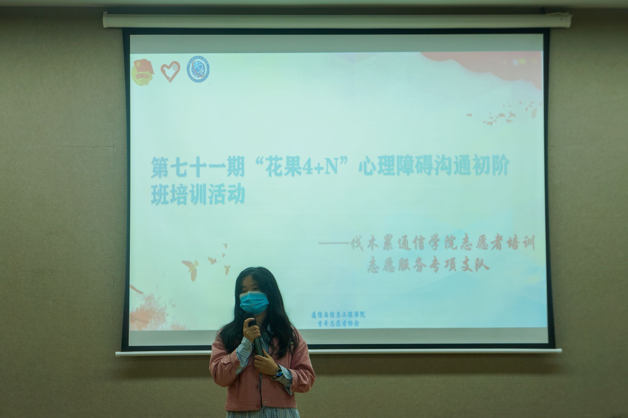 为了掌握并应用心理健康知识,培养良好的心理素质、自信精神、合作意识和开放的视野,培养学生的自我认知能力、人际沟通能力、自我调节能力,全面提高学生心理整体素养,奠定学生们良好、健康的心理素质基础。重庆移通学院通信与信息工程学院青年志愿者协会“伐木累”志愿者培训志愿服务专项支队联合电子信息类志向2班全体同学于5月10日在瀛溪书院语者演讲室组织开展了第七十一期“花果4+N”志愿者心理障碍沟通培训初阶班活动,诚邀心理咨询室的张纯霞老师作为本次活动的主讲人,为同学们进行心理健康知识的讲解。