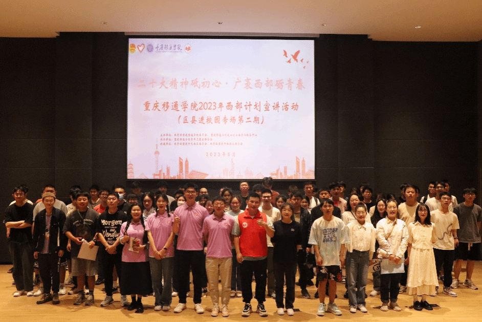 为了深入学习贯彻党的二十大精神,号召移通学子积极响应志愿服务西部计划,进一步扩大扩大西部计划项目在我校的宣传力度和影响力,促进我校毕业生及在校生全方位了解西部计划,踊跃投身西部建设,继上次宣讲活动后,我校团委又于5月12日14:30在六度空间·∞(无限)多功能厅开展“二十大精神砺初心·广袤西部砺青春”重庆移通学院2023年西部计划区县进校园专场第二期。铜梁区西部计划项目办负责同志冉鹏、巴南区西部计划项目负责同志张龙凤,以及各二级学院学工副院长、团总支书记、志愿服务板块指导老师、各学院2023年应届毕业班师生代表、服务县西部计划项目办在岗优秀志愿者代表共同出席,“线上+线下”双管齐下,区县进校园专场两期共累计参与达900余人次。