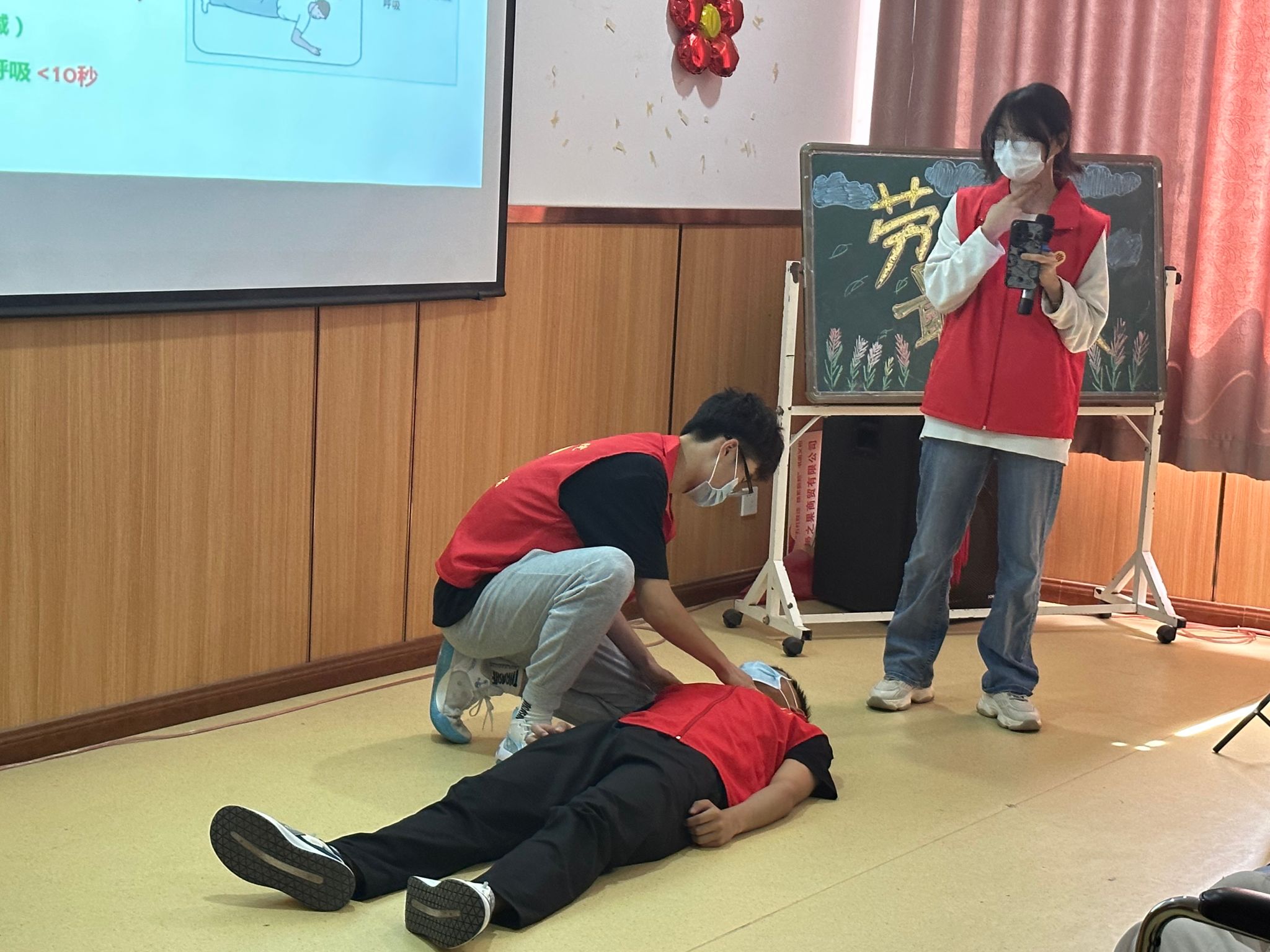 数据表明,中国每年心脏骤停患者数量约为103万,但目前我国对于心脏骤停患者的抢救存活率仍然很低。志愿者张雪琴介绍,在应急救护中,存在一个概念叫做“黄金4分钟”。在正常室温下,心脏骤停4分钟,脑细胞就会被损害。因此,在关键时刻进行高质量的心肺复苏和正确使用AED是心脏骤停患者存活的关键。其中,心肺复苏术是最直接、最有效的急救方式之一,适用于出现急性呼吸、心跳骤停等突发情况的病人。在此次活动中,志愿者对于胸外心脏按压、人工呼吸、开放气道、气管插管等操作进行了具体讲解,同时,讲述了伤口的包扎止血,局部的加压包扎或者伤口近端肢体的结扎止血理论知识,引导老人树立急救防护意识,加强自我保护能力。