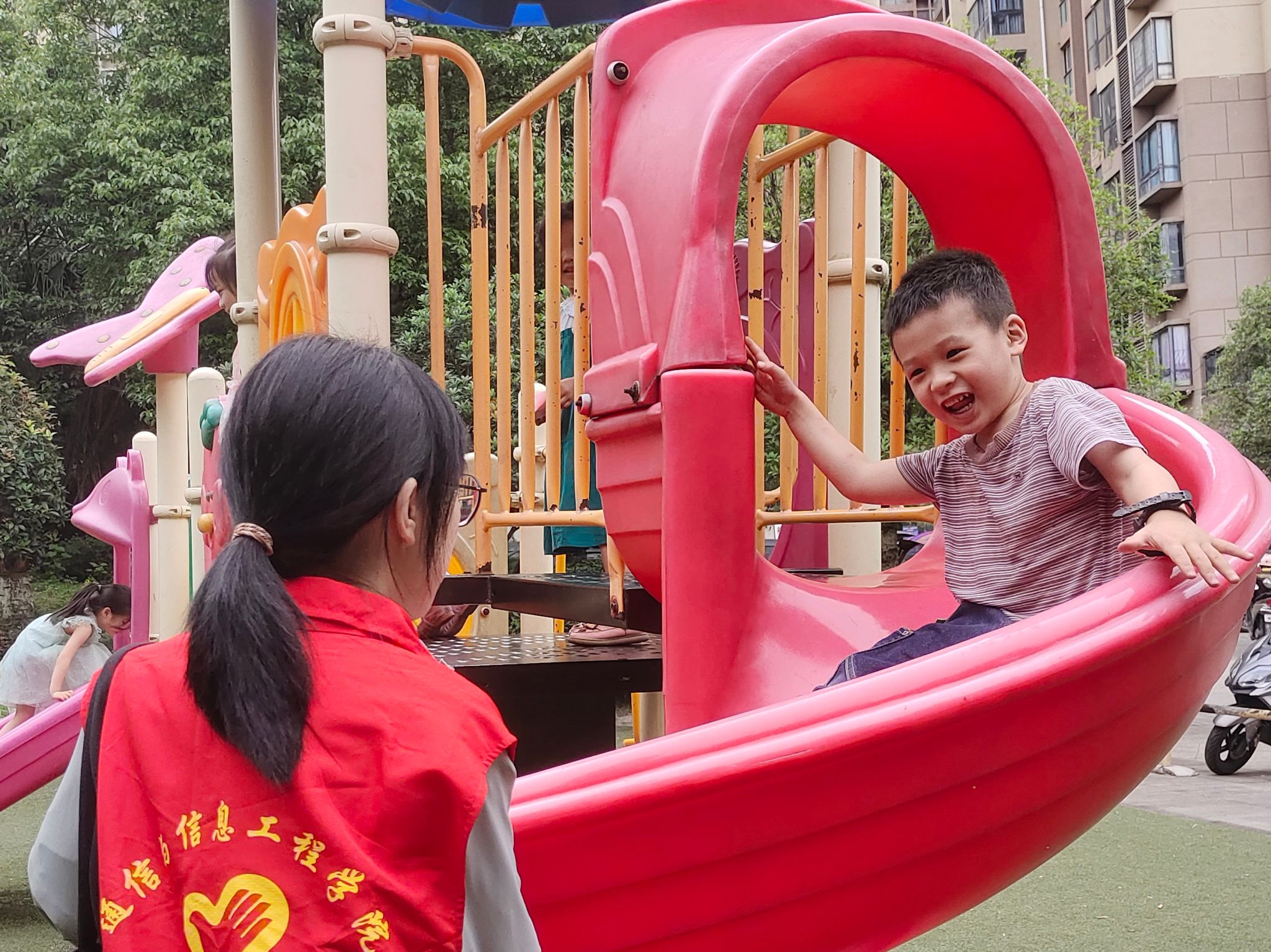 为落实“双减”政策,弘扬绿色理念,2023年5月14日,通信与信息工程学院2022级物联网工程专升本1班、2班班团支队联合“太阳花亲情驿站”关爱双职工志愿服务支队前往东邦花果山社区开展“我劳动,我快乐”环保宣传志愿服务活动。